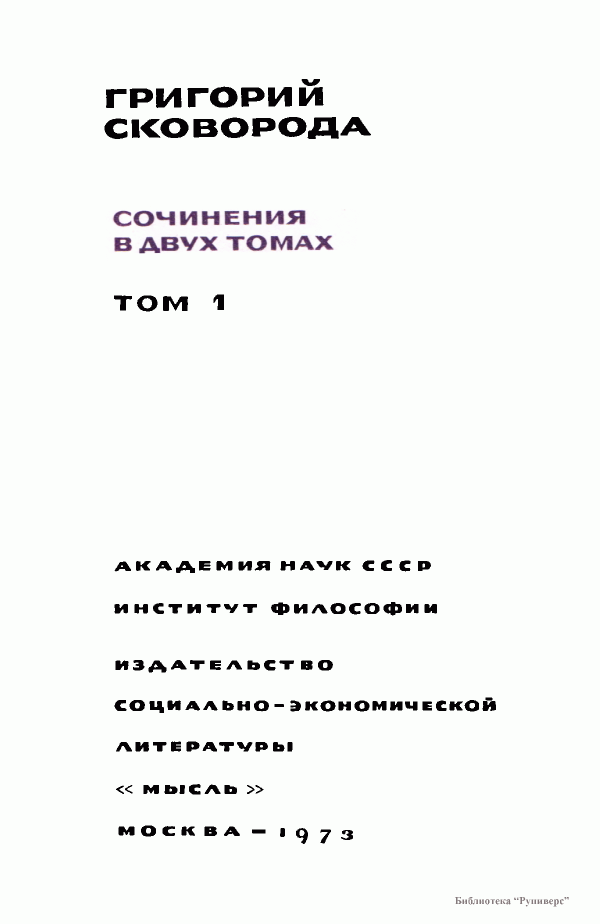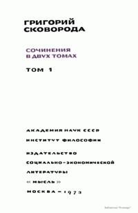 Первый том включает произведения Г. Сковороды, написанные в 1750—1775 гг. Порядок размещения произведений позволяет проследить эволюцию философских взглядов Г. С. Сковороды. Том открывается сборником стихов «Сад божественных песен». Из «Сада» выбраны песни, представляющие ценность в философском отношении. «Басни Харьковские» и последующие произведения, среди которых и два недавно найденных — «Беседа 1-я» и «Беседа 2-я», характеризуют мыслителя как философа, поставившего в центре своей системы этико-гуманистическую концепцию. Том завершает «Разговор, называемый Алфавит, или Букварь мира». В состав второго тома вошли философские сочинения Г. Сковороды, созданные им в 70—90-х годах XVIII в.: трактаты "Икона Алкивиадская" и "Жена Лотова", диалоги «Брань архистратига Михаила со Сатаною», «Пря беса со Варсавою» и «Потоп змиин» и две притчи — «Благодарный Еродий» и «Убогий Жаворонок». Помимо этого в том включены эпистолярное наследие философа, составляющее более ста двадцати писем, его филологические исследования и переводы. Заключается том биографией Сковороды, написанной его другом и учеником М. Ковалинским, которая представляет собой один из важнейших источников изучения философии и творчества Г. Сковороды.