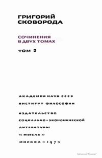Первый том включает произведения Г. Сковороды, написанные в 1750—1775 гг. Порядок размещения произведений позволяет проследить эволюцию философских взглядов Г. С. Сковороды. Том открывается сборником стихов «Сад божественных песен». Из «Сада» выбраны песни, представляющие ценность в философском отношении. «Басни Харьковские» и последующие произведения, среди которых и два недавно найденных — «Беседа 1-я» и «Беседа 2-я», характеризуют мыслителя как философа, поставившего в центре своей системы этико-гуманистическую концепцию. Том завершает «Разговор, называемый Алфавит, или Букварь мира». В состав второго тома вошли философские сочинения Г. Сковороды, созданные им в 70—90-х годах XVIII в.: трактаты "Икона Алкивиадская" и "Жена Лотова", диалоги «Брань архистратига Михаила со Сатаною», «Пря беса со Варсавою» и «Потоп змиин» и две притчи — «Благодарный Еродий» и «Убогий Жаворонок». Помимо этого в том включены эпистолярное наследие философа, составляющее более ста двадцати писем, его филологические исследования и переводы. Заключается том биографией Сковороды, написанной его другом и учеником М. Ковалинским, которая представляет собой один из важнейших источников изучения философии и творчества Г. Сковороды.
