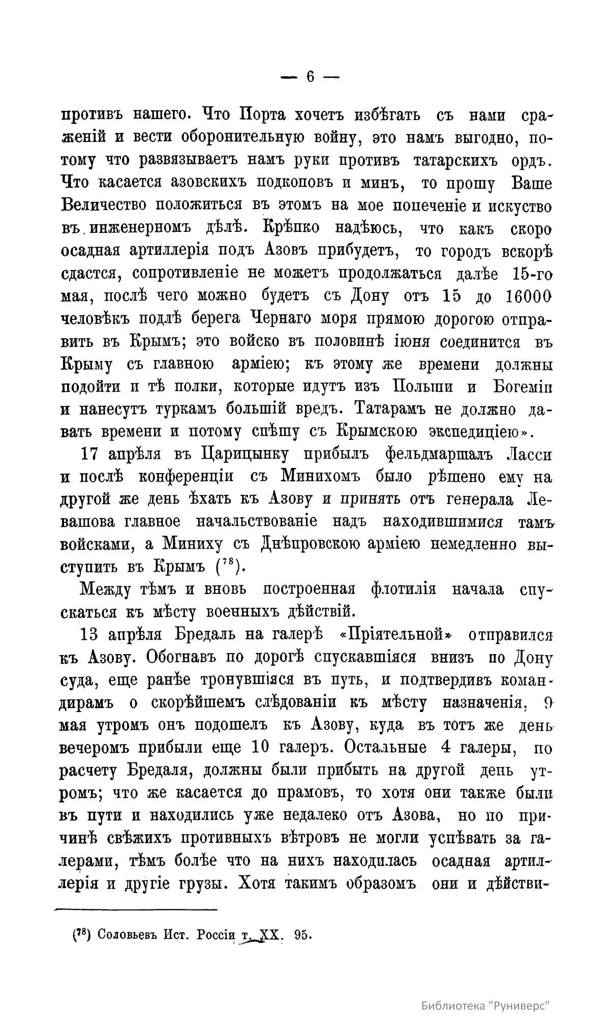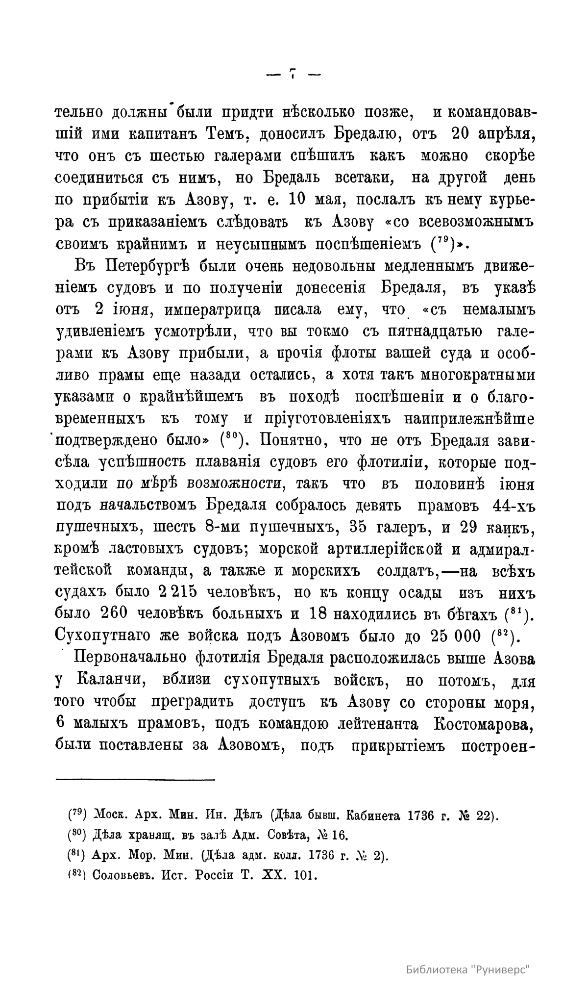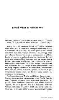 В издании подробно описывающей действия Донской и Днепровской флотилий во время Русско-турецкой войны 1736–1740 годов в правление императрицы Анны Иоанновны. В тексте объясняются сложные внешнеполитические причины начала конфликта, включая польский и крымский вопросы, а также дипломатические усилия по заключению союза с Персией для ослабления Турции. Значительная часть материала посвящена осаде Азова в 1736 году под командованием фельдмаршалов Миниха и Ласси, включая логистику и непосредственное участие флотилии под руководством Бредаля. Также детально излагаются трудности, связанные с строительством и переброской Днепровской флотилии для кампании 1737 года, направленной на взятие Очакова, с указанием проблем с транспортировкой судов через днепровские пороги и последующих претензий к их конструкции.
