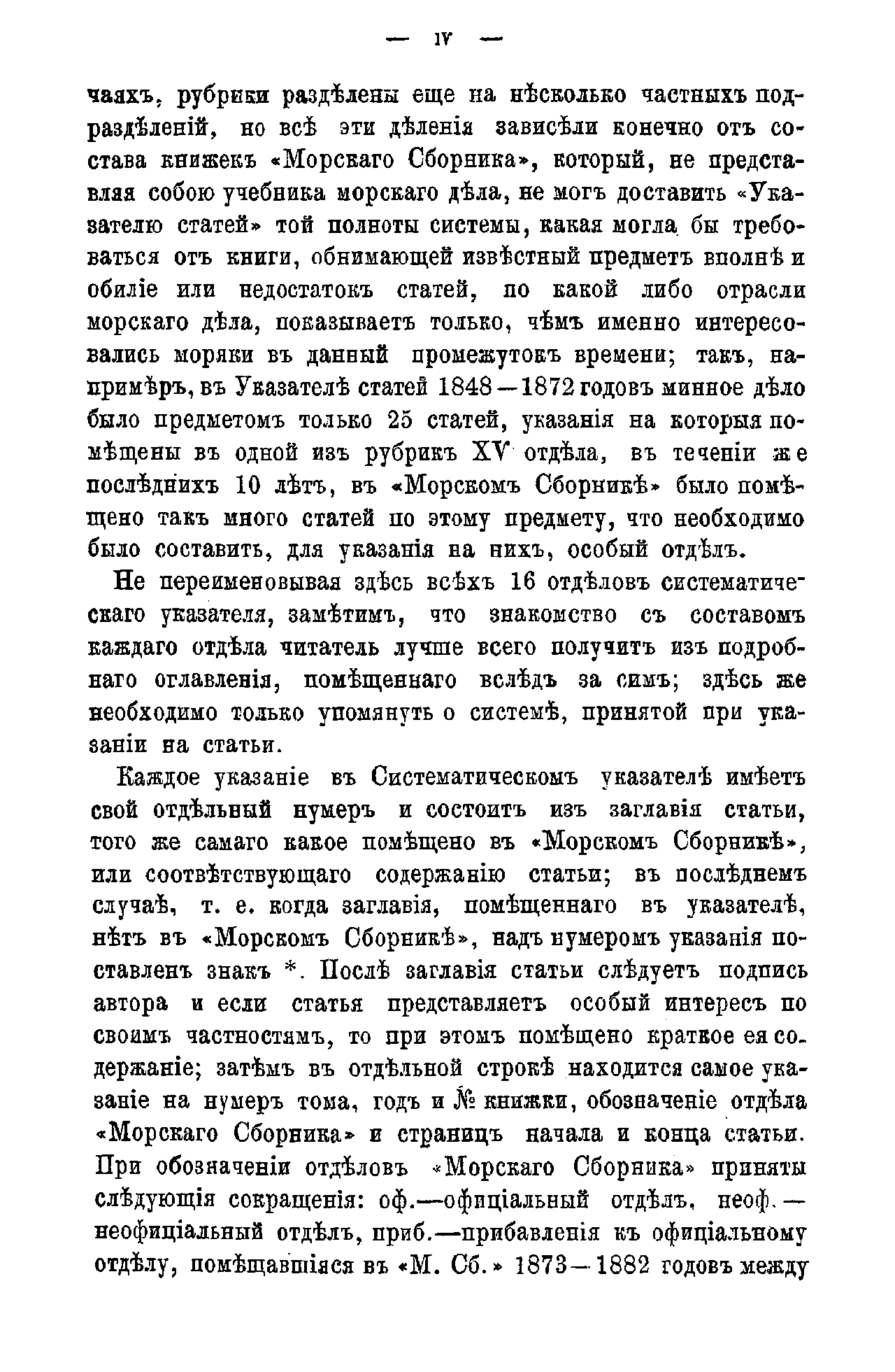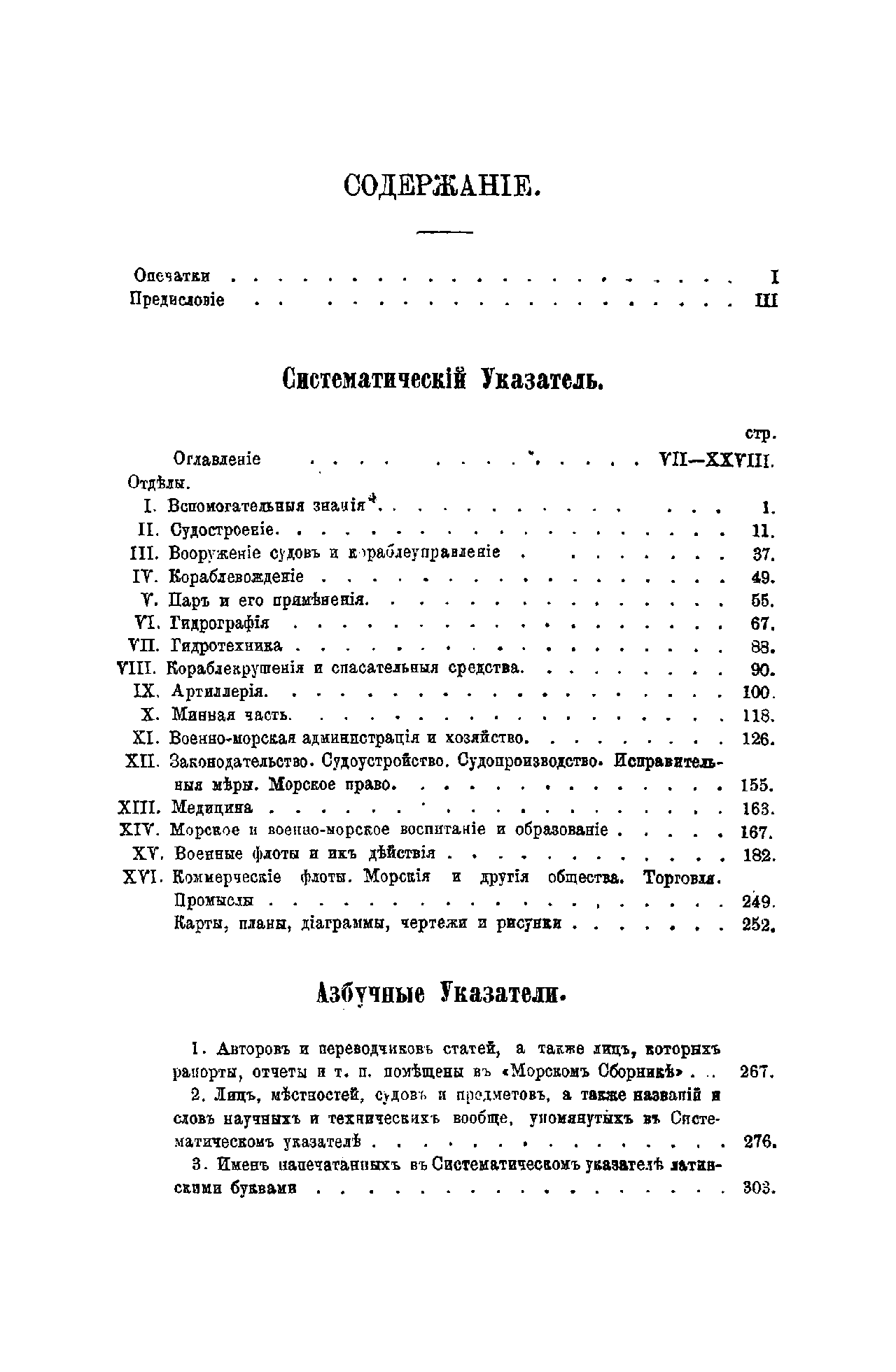 Систематический указатель к статьям, помещенным в «Морском сборнике», как в этом, так и в предыдущем библиографическом справочнике (См. Петров И.И. Указатель статей «Морского сборника» 1848–1872 годов. СПб. 1875), состоит из 16-ти тематических разделов, а также разделов, посвященным картам, чертежам, рисункам и портретам. Статьи сгруппированы по следующим разделам: вспомогательные знания, судостроение, вооружение судов и кораблеуправление, кораблевождение, пароходство, гидрография, гидротехника, кораблекрушения и спасательные средства, артиллерия, военно-морская администрация и хозяйство, законодательство и морское право, медицина, морское воспитание и образование, морские общества и заведения, военные флоты и их действия, коммерческие флоты и морские промыслы. Всего же библиографический указатель в двух справочниках включает до 20 тысяч позиций. Помимо этого имеется именной указатель авторов, принимавших участие в «Морском сборнике» за этот период.