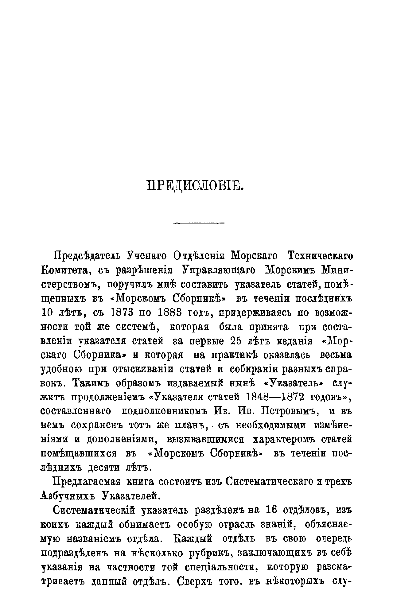 Продолжение (вторая часть) систематического указателя статей «Морского сборника» выполнил известный историк флота Н.И. Зеленой, который по поручению председателя Ученого отделения Морского технического комитета расширил это издание до 1882 г., полностью сохранив его структуру.