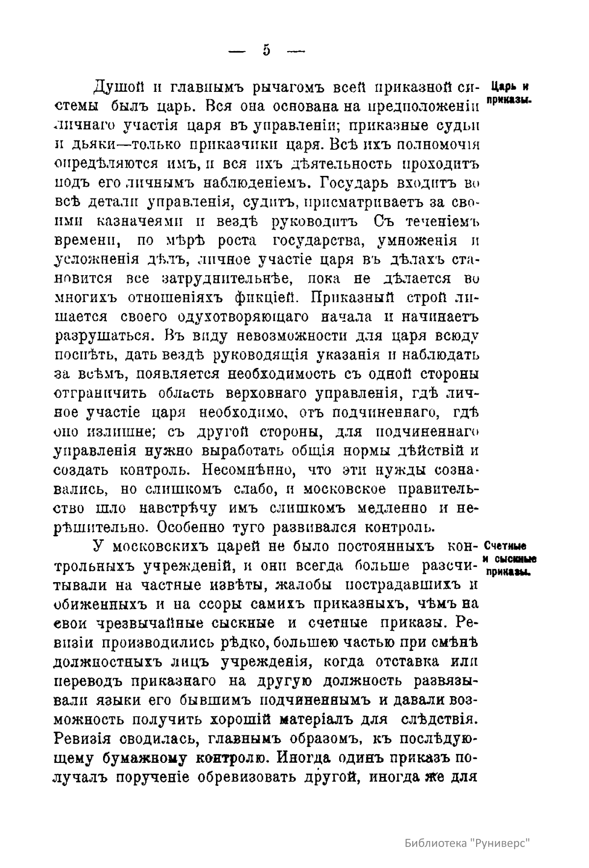 В издании анализируется система приказов, центральных исполнительных органов Московского государства, существовавших более двух столетий, прослеживается эволюция приказов от временных поручений до постоянных учреждений, подчеркивая их органический и несистематизированный рост, который, тем не менее, обеспечил системе практичность и устойчивость. Особое внимание уделяется роли царя как «души» системы, а также проблемам контроля, волокиты и коррупции, которые усилились при царях Михаиле Федоровиче и Алексее Михайловиче, что привело к возникновению Тайного приказа как симптома упадка старой системы. Подробно описывается структура и личный состав приказов (судей, дьяков и подьячих) и дается обзор важнейших приказов по их функциям и территориальной юрисдикции.