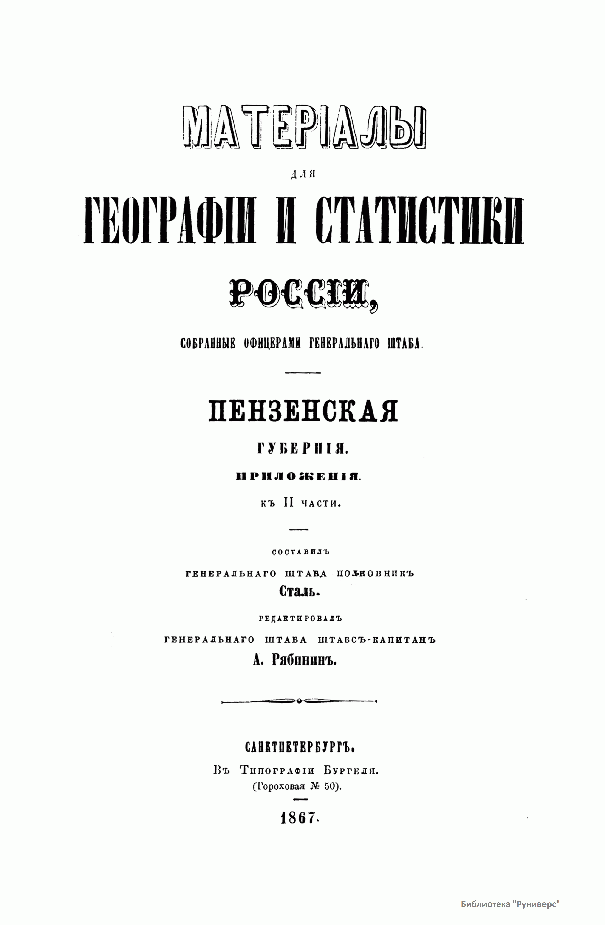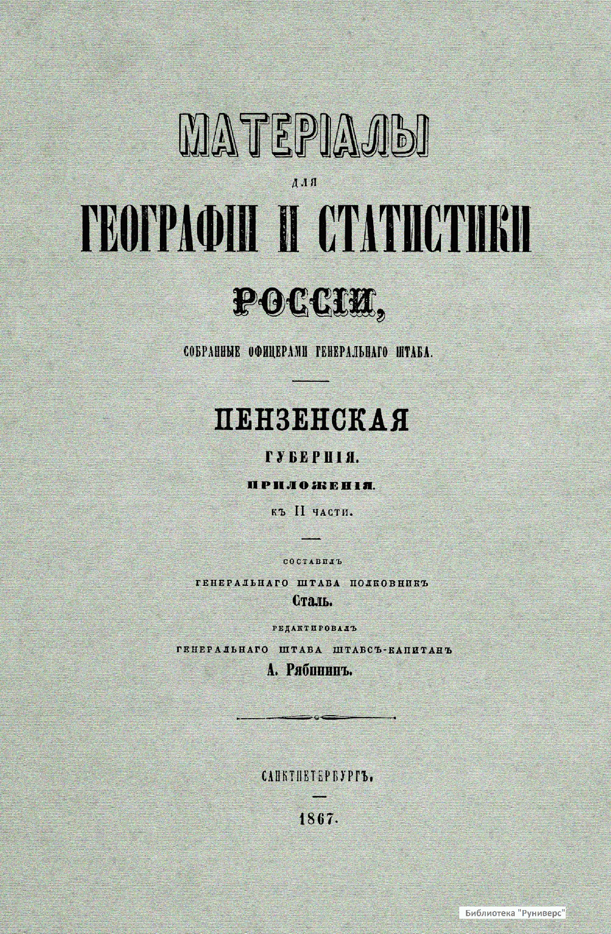 Матерiалы для географiи и статистики Россiи, собранные офицерами Генеральнаго штаба. Пензенская губернiя. Приложенiя к 2 части