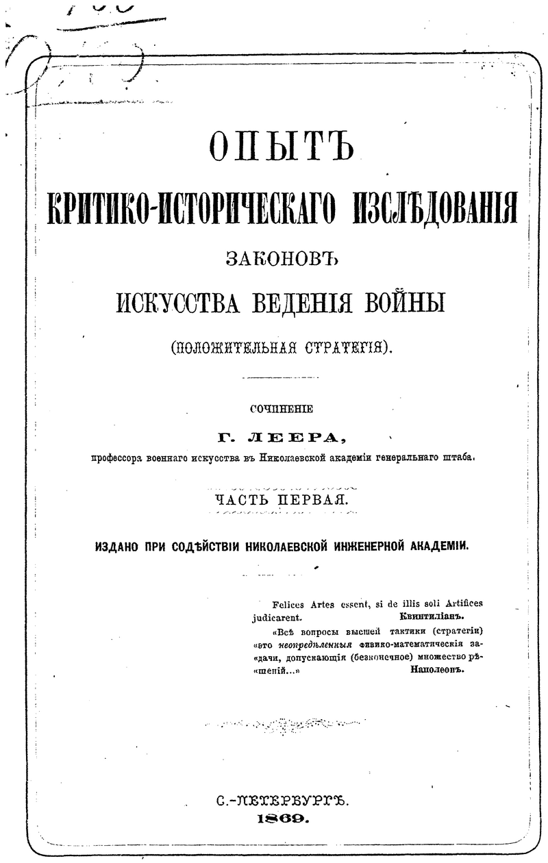 Концептуальное исследование выдающегося российского военного теоретика и учёного генерала от инфантерии Генриха Антоновича Леера является ключевым элементом в разработке теории военной стратегии. Г.А. Леер долгие годы преподавал разработанный им курс военной стратегии в ведущих военно-учебных заведениях Российской империи, с 1889 по 1898 гг. руководил Академией Генерального Штаба. Благодаря своим исследованиям, приобрел широкую международную известность и признание в мировом военно-историческом сообществе. В основе своих исследований, изложенных в данной работе, автор придавал огромное значение военной истории и исторической подготовке офицеров. Данный труд в своей концептуальной базе носит идеалистический характер, но под влиянием требований практики разработан с точки зрения военной теории на основе обобщения мирового военно-исторического опыта. Предложенный автором метод анализа военно-исторических исследований носил ярко выраженный прикладной характер.