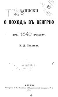 Книга известного российского военного писателя генерал-майора М.Д. Лихутина посвящена событиям, связанным с его участием в молодости в боевых действиях русских экспедиционных войск, которые были введены в Галицию и Трансильванию для помощи Австрии в подавлении восстания в Венгрии летом 1849 г. Находясь при штабе 4-го корпуса под командованием генерала от инфантерии М.И. Чеодаева в качестве офицера для особых поручений, Лихутин в своих путевых заметках подробно и живо описывает плачевное состояние общества в многонациональной империи Габсбургов, расколотой межэтническими и межконфессиональными распрями. Автор в своих мемуарах детально рассказывает о боях с участием дивизий и полков 4-го корпуса русской армии по овладению городом Дебречин (Дебрецин), который являлся в это время столицей революционной Венгрии, преследовании русскими войсками повстанческой венгерской армии Гёргея, участии в сражении под Мишкольцами и других событиях этой кампании вплоть до капитуляции революционных войск Венгрии.