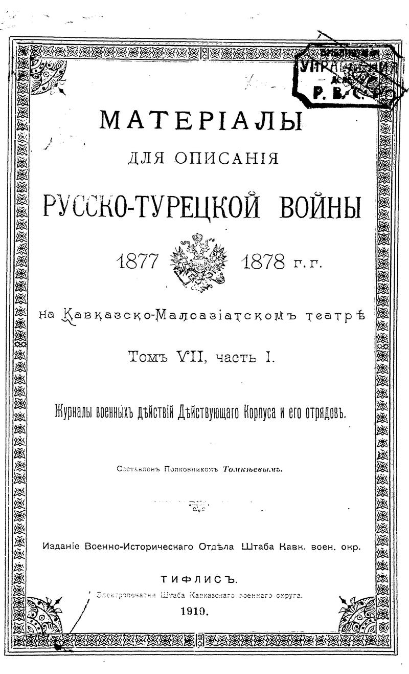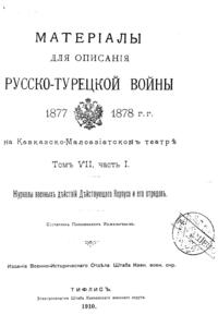 Материалы для описания русско-турецкой войны 1877-1878 гг. на Кавказско-Малоазиатском театре. Том VII, часть I