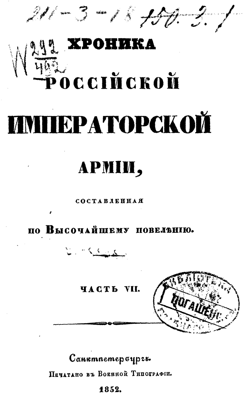 Важнейший энциклопедический справочник, содержащий детальную историю всех российских войсковых частей. Составлен в правление Николая I.