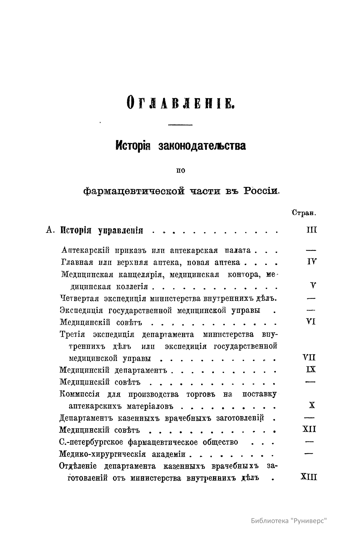 • История законодательства: В книге представлен масштабный исторический очерк управления фармацевтической частью, начиная с учреждения Аптекарского приказа (XVII век) и заканчивая реформами второй половины XIX века,. Рассматривается эволюция фармацевтического сословия, появление первых «вольных» (частных) аптек и развитие военного аптечного дела,.