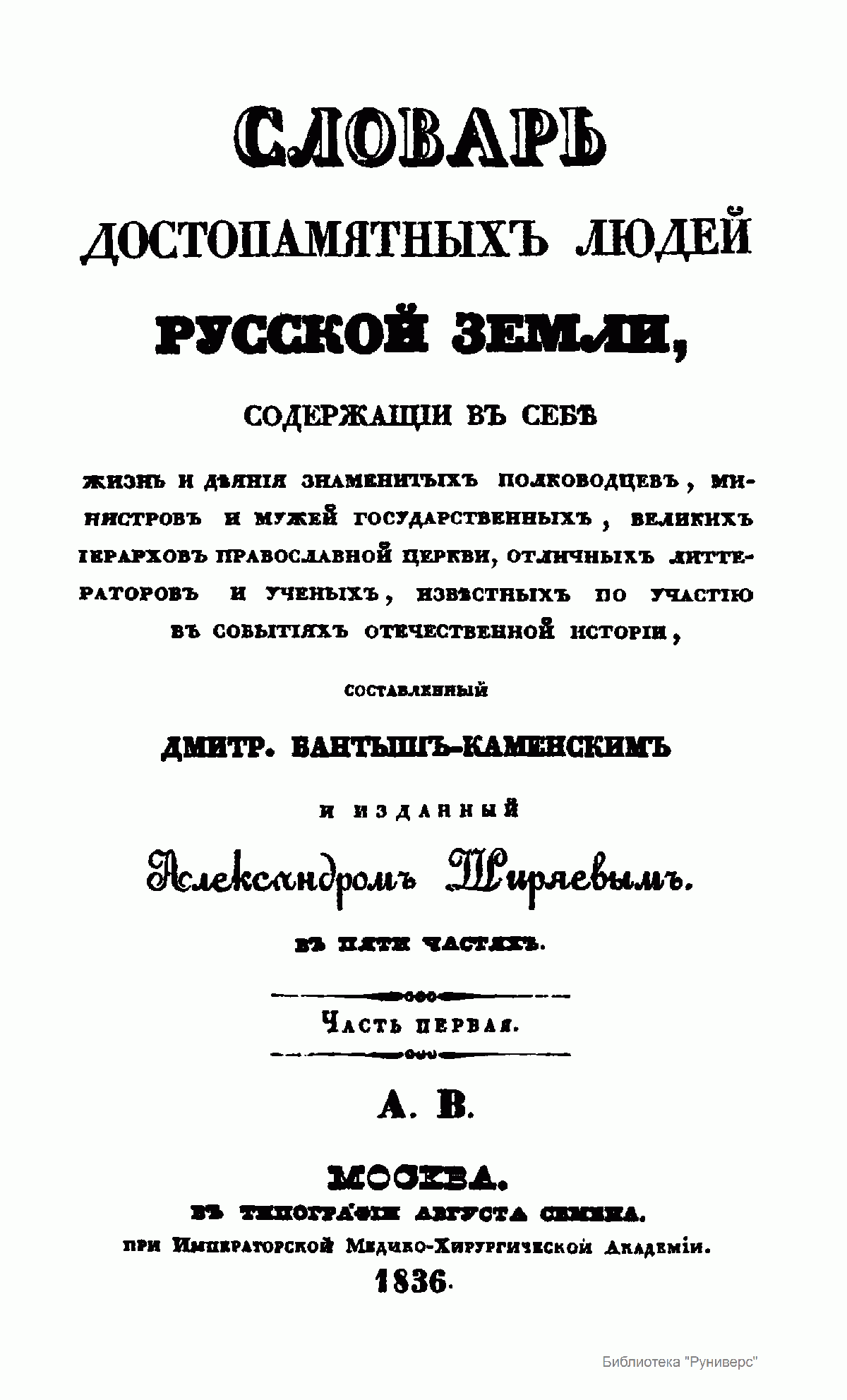 «Словарь достопамятных людей Русской земли…», впервые вышедший в свет в 1836 г. в пяти частях, фактически стал главным трудом видного историка, писателя и археографа николаевской эпохи Д.Н. Бантыш-Каменского. Получив прекрасное домашнее образование, автор последовательно шел по стопам своего отца, известного государственного деятеля, историка и архивиста