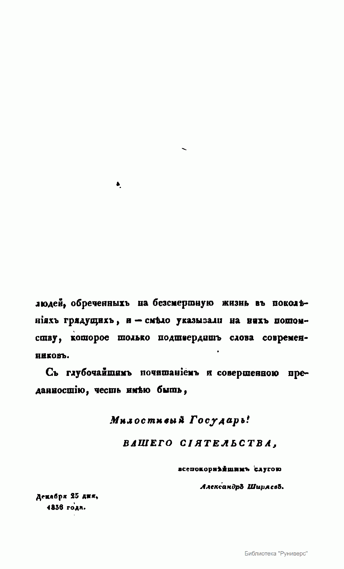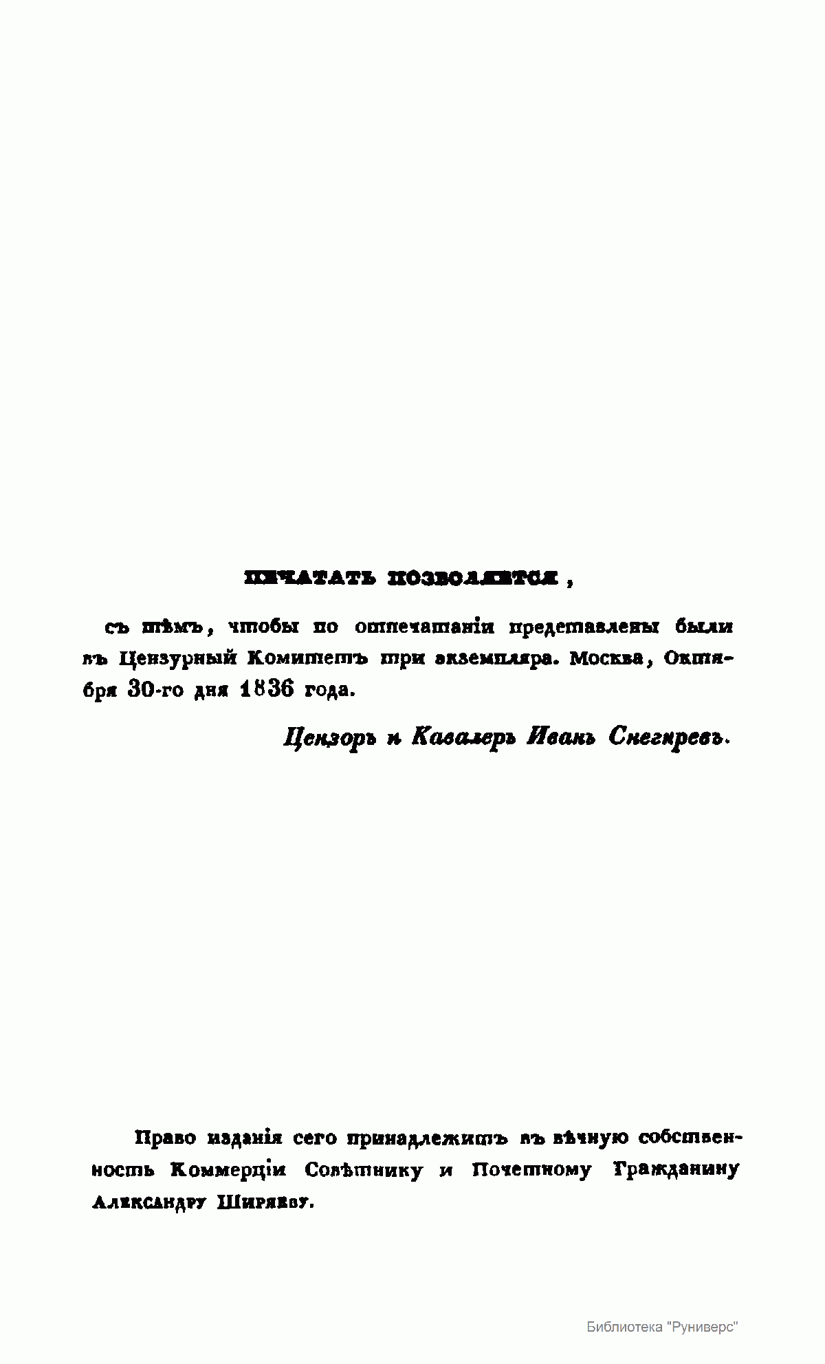 На обороте титульного листа имеется разрешение цензора: "Печатать позволяется с тем, чтобы по отпечатании представлены были в Цензурный Комитет три экземпляра. Москва, Октября 30-го дня 1836 года. Цензор и Кавалер Иван Снегирев".
