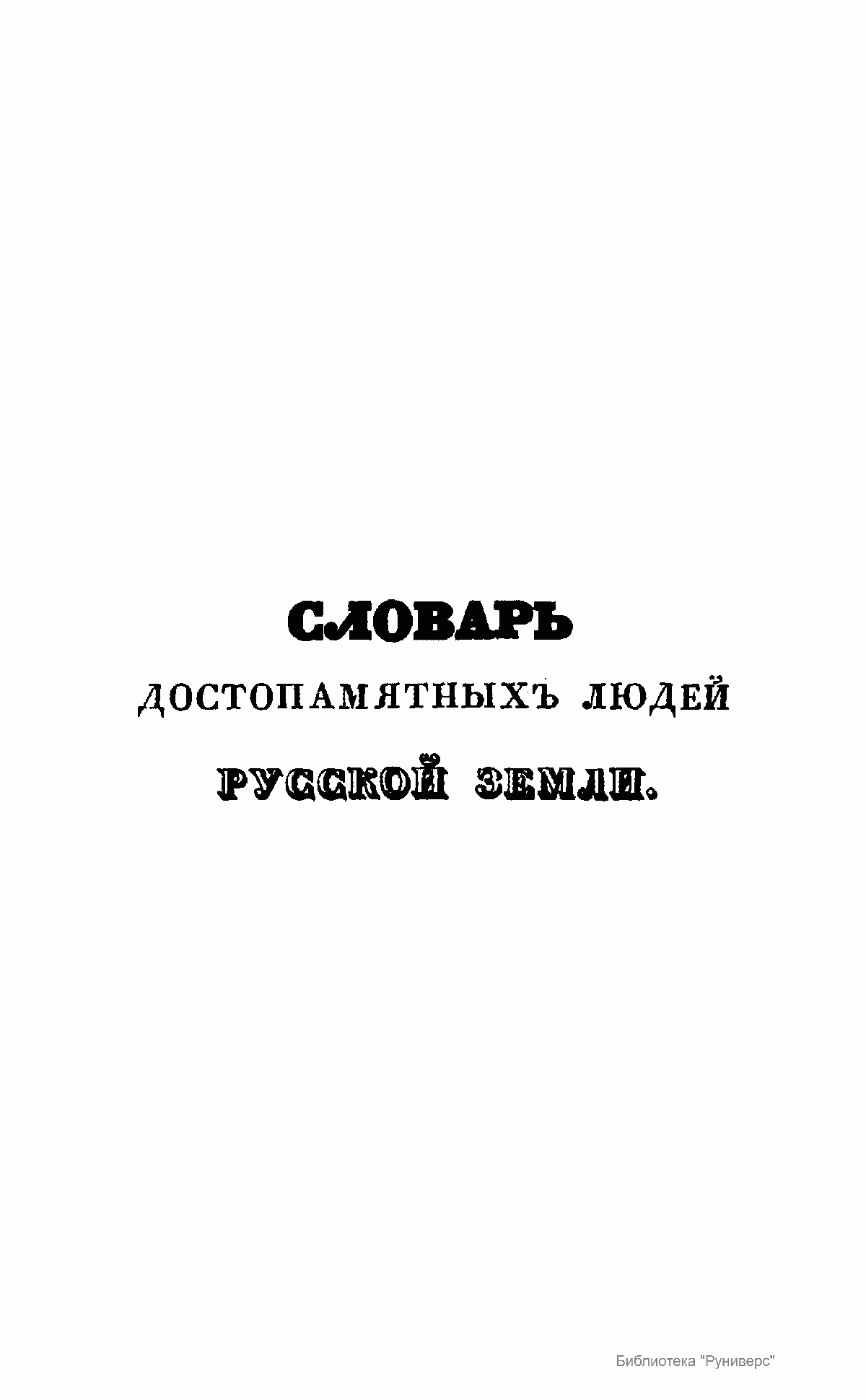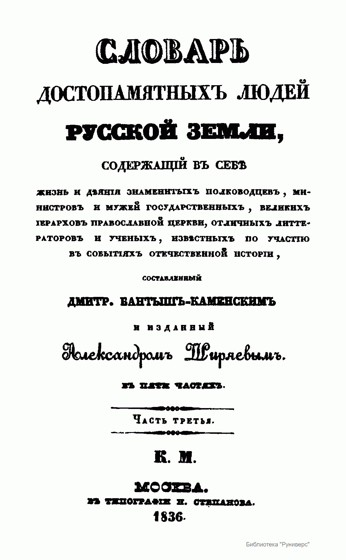 «Словарь достопамятных людей Русской земли…», впервые вышедший в свет в 1836 г. в пяти частях, фактически стал главным трудом видного историка, писателя и археографа николаевской эпохи Д.Н. Бантыш-Каменского. Получив прекрасное домашнее образование, автор последовательно шел по стопам своего отца, известного государственного деятеля, историка и архивиста