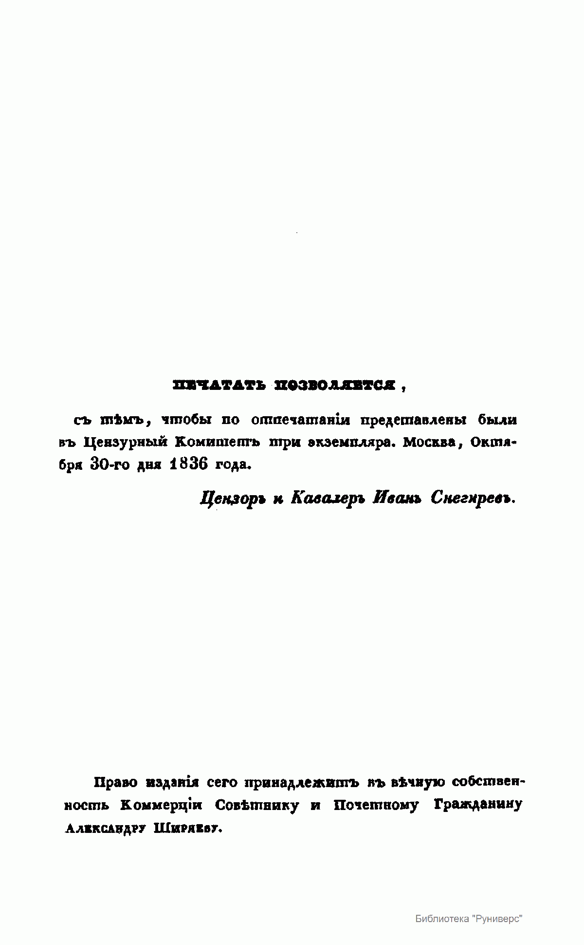 На обороте титульного листа имеется разрешение цензора: "Печатать позволяется с тем, чтобы по отпечатании представлены были в Цензурный Комитет три экземпляра. Москва, Октября 30-го дня 1836 года. Цензор и Кавалер Иван Снегирев".