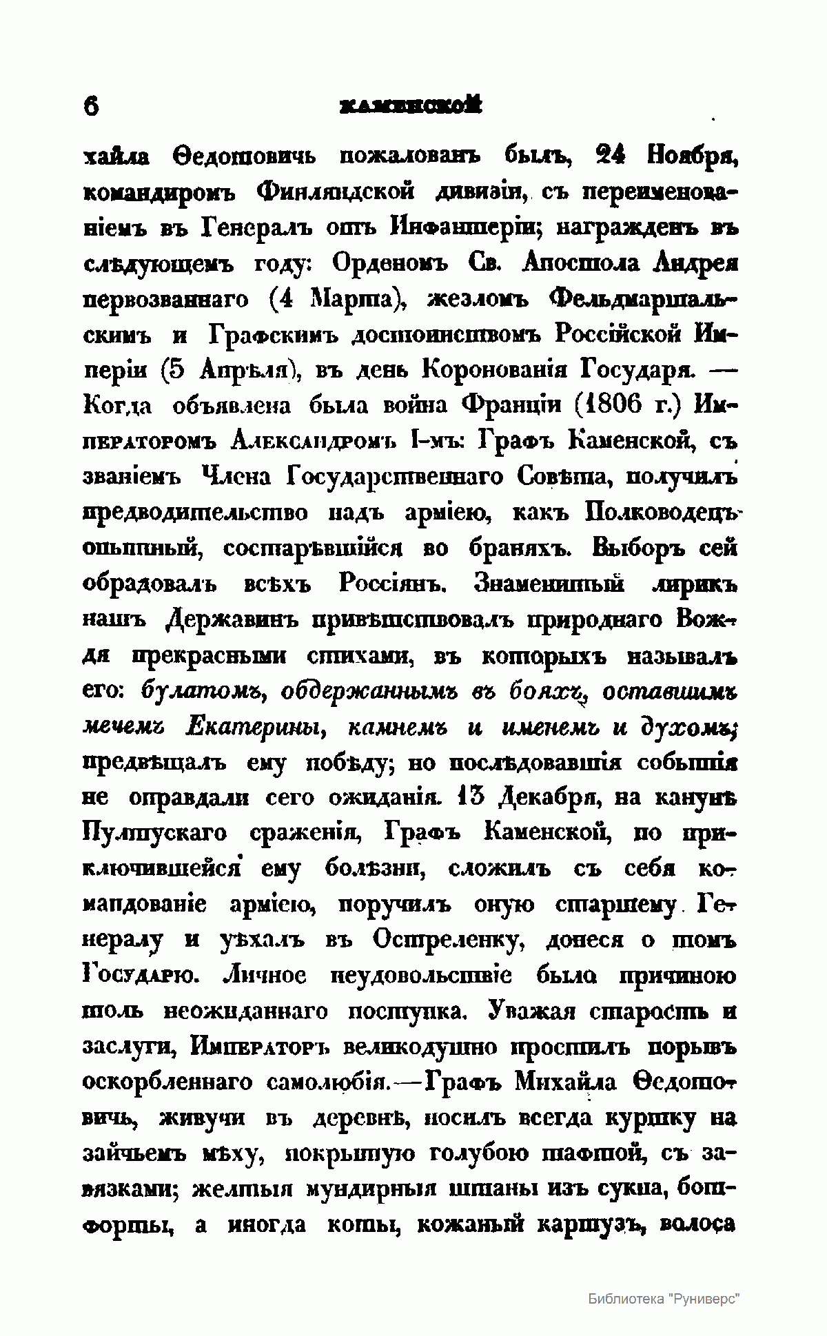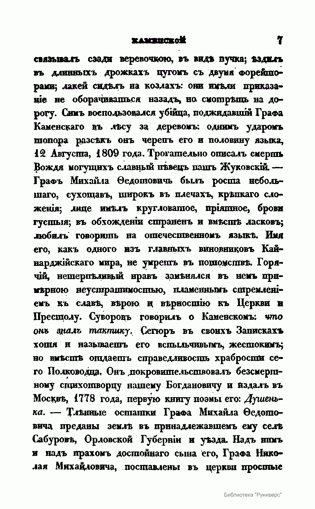 (1833); «Жизнь Мазепы» (1834); «Биографии российских генералиссимусов и генерал-фельдмаршалов», в 4-х частях СПб., 1840–41. Кроме перечисленных трудов Бантыш-Каменского, некоторые отдельные его многочисленные брошюры (об отце – Н.Н. Бантыш-Каменском, преосвященном Амвросии, архиепископе Московском) позже были включены в его «Словарь».