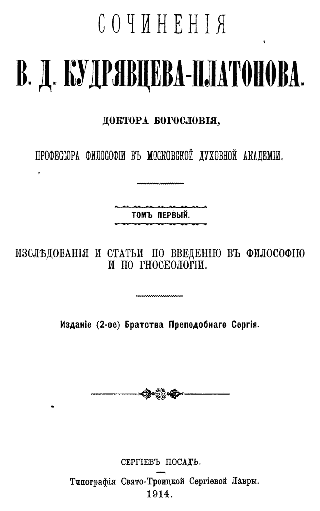 Посмертное издание собрания сочинений видного представителя русского теизма – профессора Московской Духовной академии и Председателя Братства Преподобного Сергия. Несмотря на то, что в истории русской философии Кудрявцев-Платонов не получил известности как основатель оригинальной философской системы, его по праву считают превосходным философским писателем и талантливым выразителем идеи непротиворечивого сочетания философского миросозерцания и христианского учения.