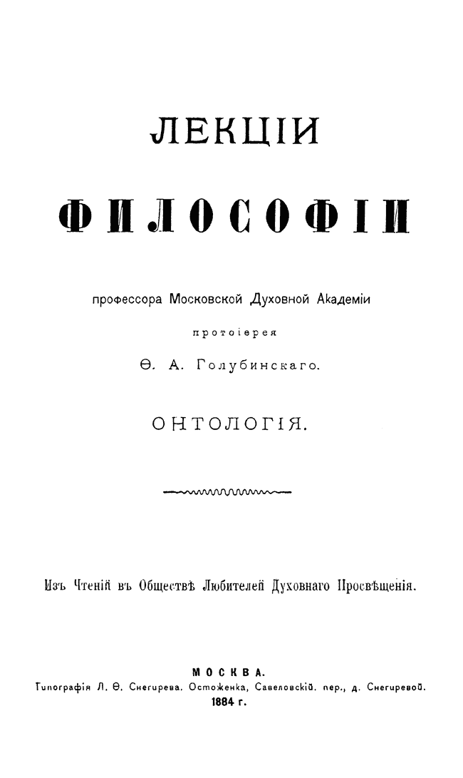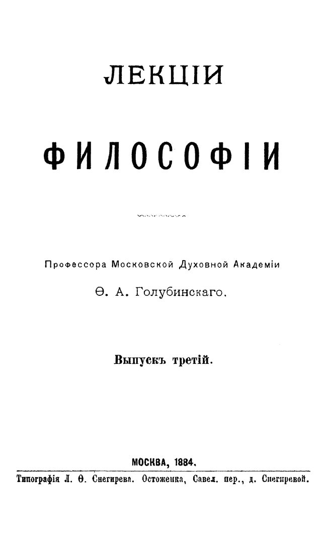Лекции выдающегося русского философа, профессора Московской духовной Академии, пользовавшегося огромным научным и нравственным авторитетом среди современников. В личности Голубинского высокая ученость сочеталась с глубокой духовностью. Признанный основателем русской теистической философии, Ф.А. Голубинский был облечен священным саном и являл по воспоминаниям всех знавших его пример подлинно христианской жизни.
