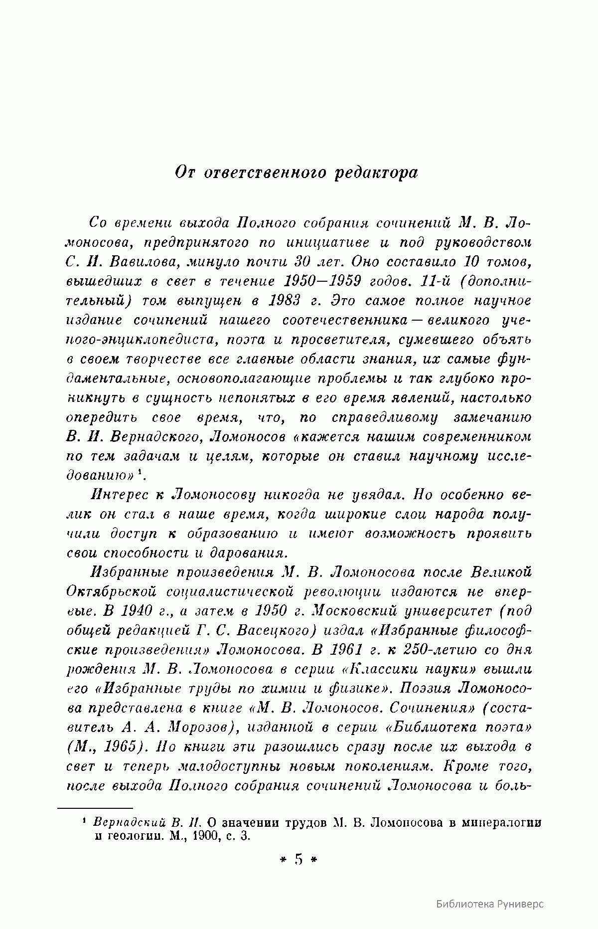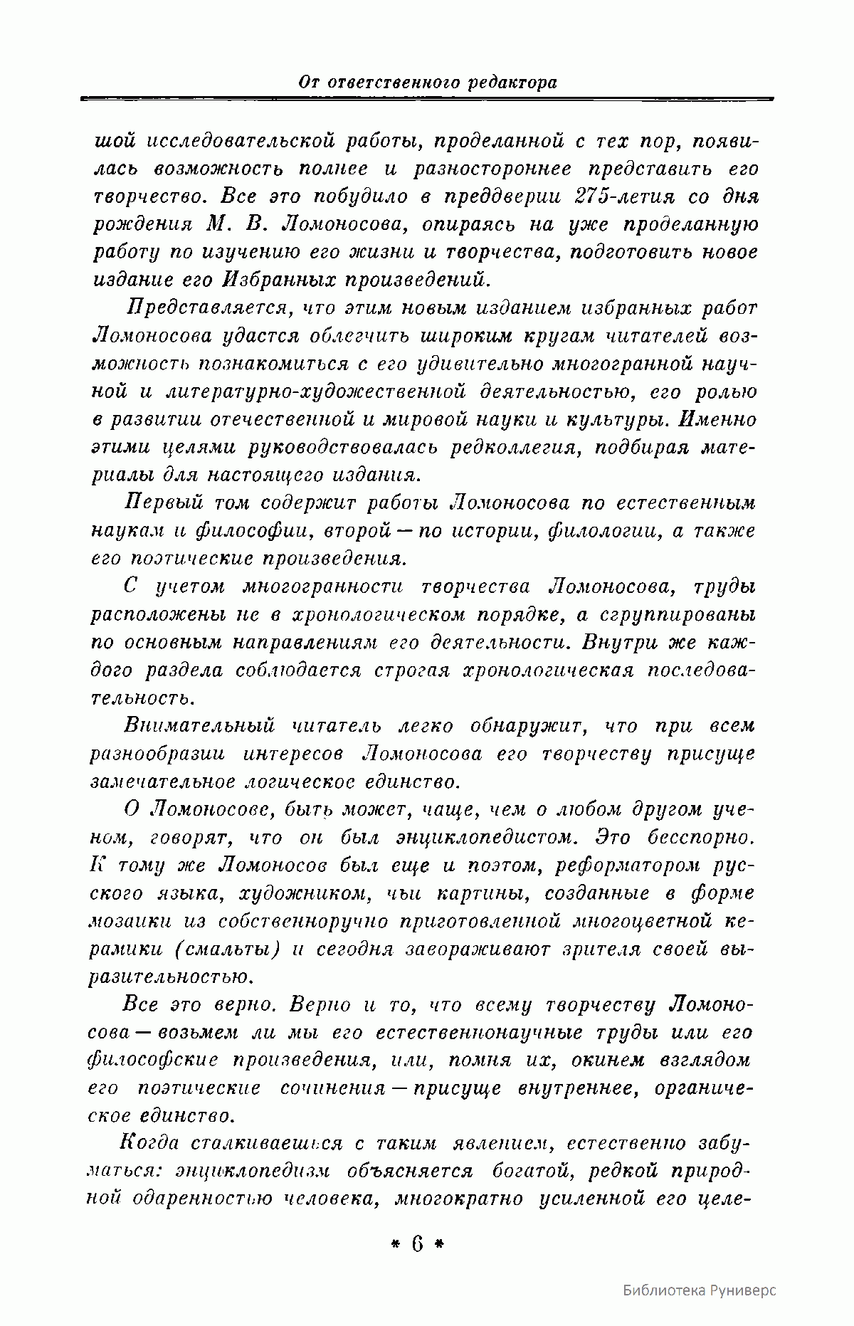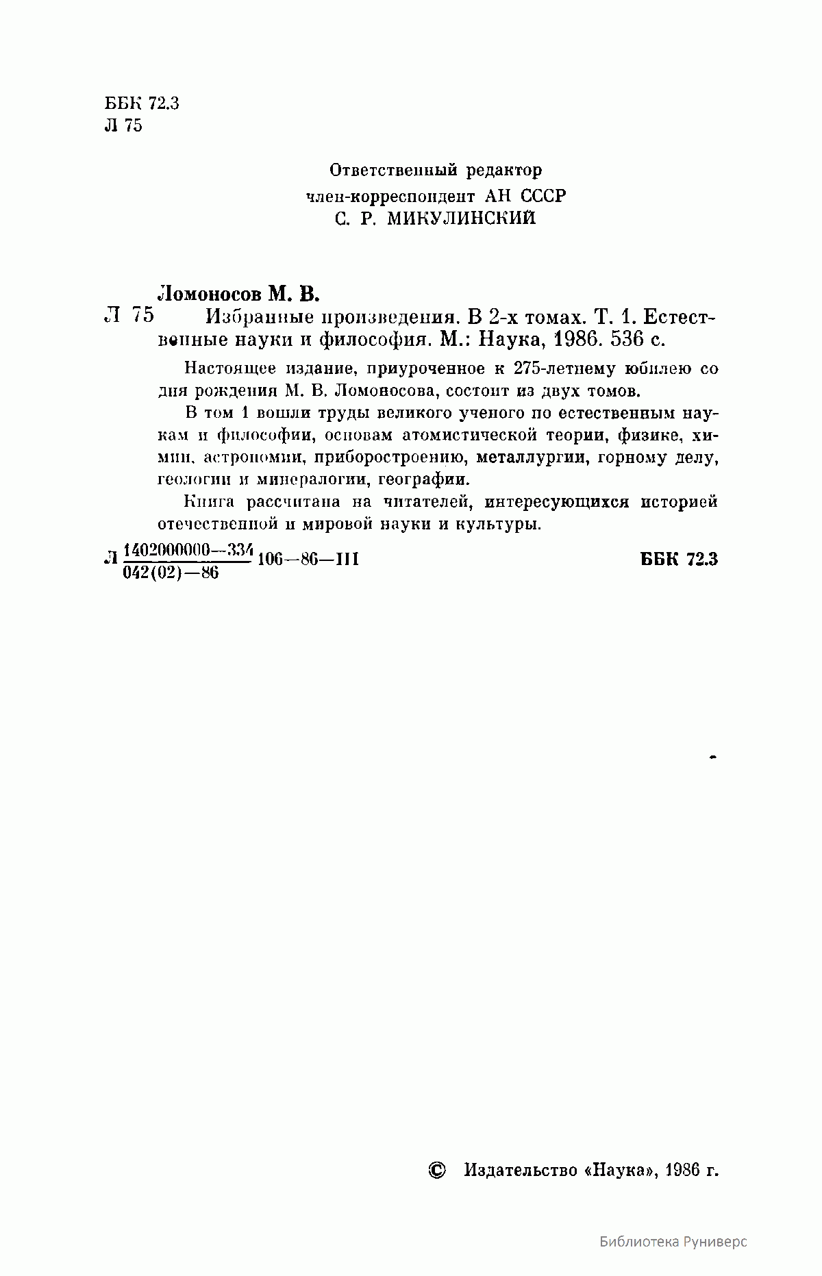Данное двухтомное собрание избранных произведений великого российского ученого и просветителя М.В. Ломоносова, включающего его основные труды в области естественных наук и философии, а также истории, филологии и поэзии, было приурочено к 275-летию со дня его рождения. Как указывается в предисловии, авторы-составители подготовили к выпуску в свет данное издание таким образом, чтобы наиболее полно и рельефно дать читателю представление об органичном единстве взглядов великого ученого-патриота в кажущихся совершенно различными областях знаний. Именно благодаря энциклопедическим воззрениям Ломоносова и его подлинно национальном мировоззрении в развитии научного творчества, открытия великого ученого-реформатора порой выглядят гениально просто и одновременно взаимосвязано. Взгляды Ломоносова на развитие научных знаний, воспитании всесторонне образованных ученых, обладающих необычайной широтой познаний не только в сфере науки, но и литературы, поэзии и искусства, при этом беззаветно преданных России, и поныне являются актуальными и весьма значимыми для отечественной науки.