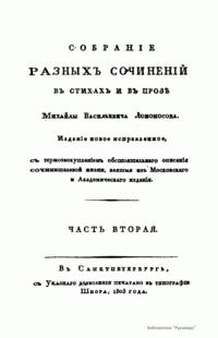 Собранiе разныхъ сочиненiй въ стихахъ и въ прозѣ Михайлы Васильевича Ломоносова. Часть вторая
