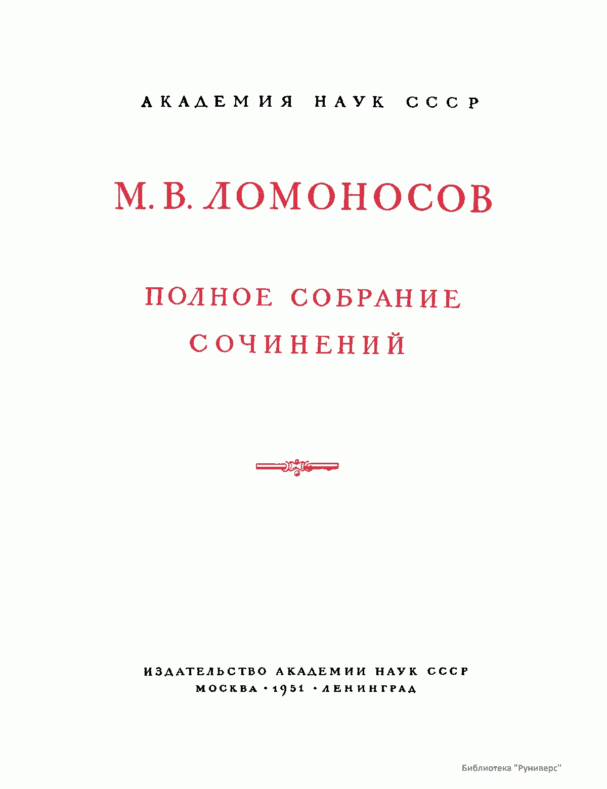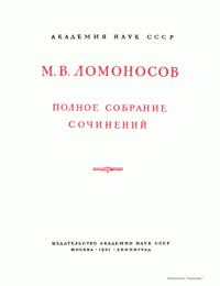 Михаил Васильевич Ломоносов – человек необъятных дарований и научной энергии, величайшей деятель культуры XVIII века, лучший продолжатель идей петровского времени. Ломоносов работал в области всех известных в его время наук и почти в каждой сделал замечательные открытия. Он был философом, физиком, химиком, металлургом, географом, биологом, астрономом, филологом одновременно. В этом отношении Ломоносов был последним представителем фаланги великих людей, выдвинутых во всей Европе эпохой Возрождения, людей типа Леонардо да Винчи или Галилея. Белинский так писал о Ломоносове: «Ослепительно и прекрасно было это явление. Оно доказало собой, что человек есть человек во всяком состоянии и во всяком климате, что гений умеет торжествовать над всеми препятствиями, какие ни противопоставит ему враждебная судьба, что, наконец, русский способен ко всему великому и прекрасному». Настоящее издание сочинений Ломоносова наиболее полное из всех. Оно подготовлено на основе большой работы ученых по разысканию, описанию и изучению разнообразного и богатейшего научного наследия Ломоносова. В издание включается несколько сот документов, не вошедших в последнее академическое издание и ранее не опубликованных. В число этих документов входит ряд статей и заметок научного значения, автобиографически документы, переводы и разнообразные служебные бумаги, характеризующие Ломоносова как выдающегося организатора русской науки и просвещения XVIII века. Особо следует отметить документы, относящиеся к деятельности Ломоносова как ученого-экспериментатора. Все публикуемые тексты сверены с первоисточниками – рукописями и прижизненными изданиями. В отдельных случаях, когда ни рукописей, ни прижизненных изданий не сохранилось, текст печатается по наиболее достоверному, критически изученному источнику. Произведения печатаются по новой орфографии с заменой пунктуации Ломоносова современной пунктуацией, но с сохранением, по возможности, всех особенностей, присущих языку Ломоносова. Все тексты, написанные на латинском языке, печатаются одновременно на языке оригинала и в русском переводе. Произведения Ломоносова распределены по разделам его деятельности. Каждому разделу посвящен один том или несколько томов, в зависимости от объема материала. В пределах каждого тома произведения расположены хронологически по времени их написания или публикации. Некоторые отступления от этого принципа сделаны лишь в отдельных случаях, когда это вызывалось необходимостью сохранить органическую связь между однородными произведениями. В отличие от старых изданий сочинений Ломоносова, в которых при распределении материала сначала печатались художественные произведения и филологические труды, в настоящем издании первые тома посвящены научным трудам по физике, химии и другим естественным наукам. В конце каждого тома даются краткие примечания справочного характера к опубликованным в томе работам и указатель личных имен. Настоящее полное собрание сочинений Ломоносова осуществляется Главной редакцией издания при непосредственном участии Комиссии по истории Академии Наук СССР, архива Академии Наук СССР и приглашенных специалистов.
