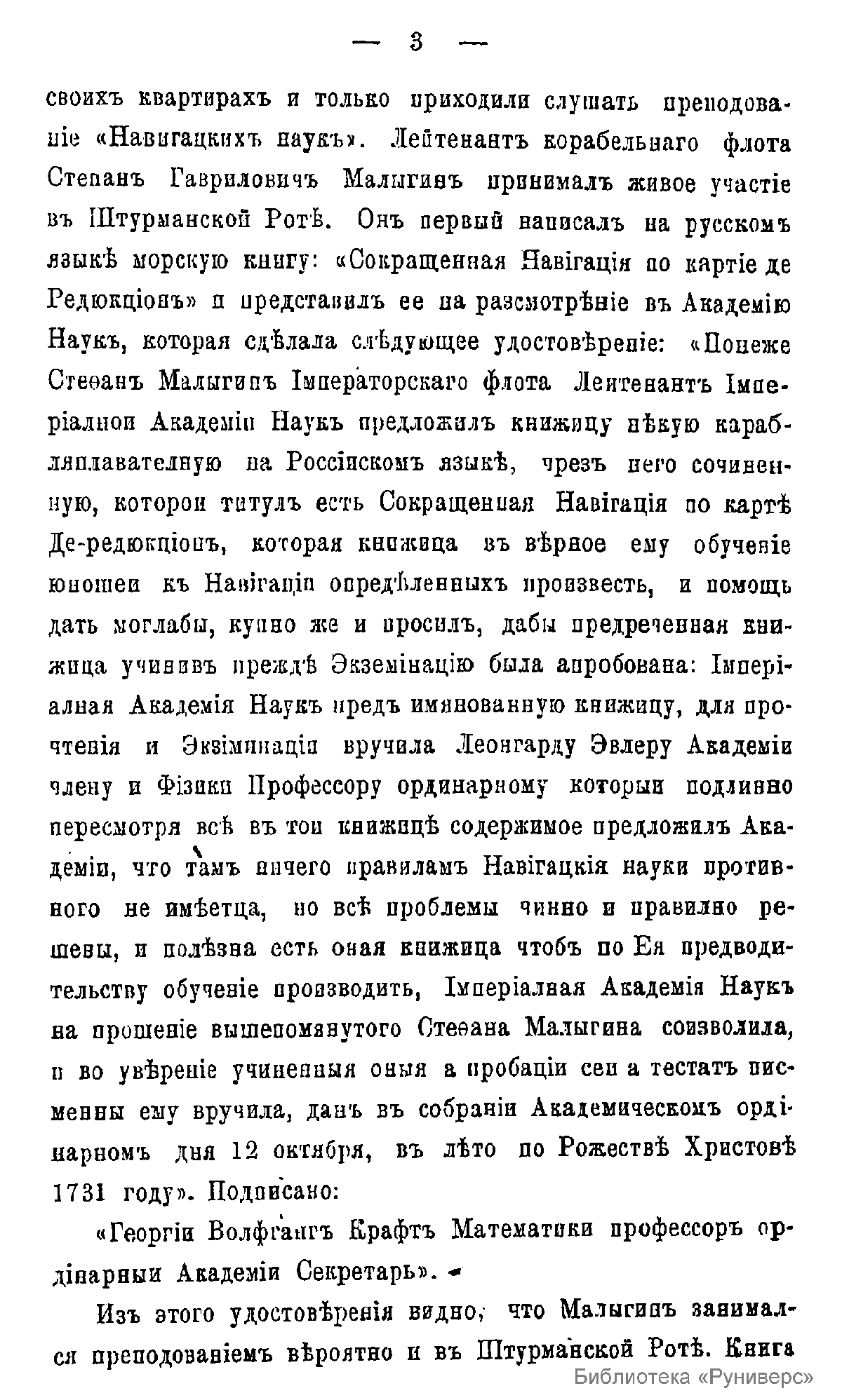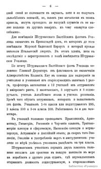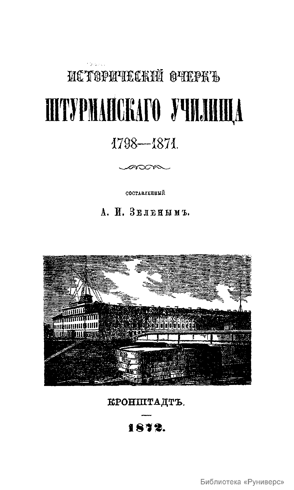 Данный очерк был подготовлен известным исследователем и ученым генералом Александром Ильичем Зеленым, который всю свою жизнь посвятил педагогической деятельности в морских учебных заведениях. Книга была издана в преддверии грядущей реорганизации училища в Морское Техническое, ранее носившее название Техническое училище Морского ведомства. Именно в 1872 году это училище образовалось путем слияния двух учебных заведений – Штурманского, существовавшего в Кронштадте с 1798 года, и Инженерного училища Морского ведомства, переведенного из Петербурга. С 1771 по 1798 гг. в морской крепости Кронштадт размещался Морской кадетский корпус. Но император Павел Петрович, вступив на престол, обратил внимание на флот и повелел перевести морских кадет из Кронштадта в Петербург. Одновременно он учредил два Штурманских училища, одно для Балтийского, а другое для Черноморского флотов, а также два училища корабельной архитектуры, одно для Петербургского, а другое для Черноморского Адмиралтейств. Для достижения экономии и упрочения положения флота на будущее время, по воле Павла Петровича, был учрежден особый комитет, под председательством наследника, великого князя Александра Павловича, которому было поручено: «составить точное счисление потребных сумм на содержание флотов, равно Адмиралтейской Коллегии и подчиненных ей мест». Вышеупомянутый комитет выделил из себя – «комитет по учреждению училищ для учеников штурманских и Корабельной Архитектуры»… В высочайшем повелении от 20 августа 1798 года был утвержден и штат нового училища Корабельной архитектуры. Для помещения штурманских классов училища был назначен в Кронштадте дом, в котором до того помещался Морской кадетский корпус. В 1826 году Штурманское училище было переименовано в штурманскую роту, а 10 марта 1827 года в полуэкипаж. 9 мая 1856 года полуэкипаж был вновь переименован в Штурманское училище, которое в 1867 г. было слито с артиллерийским, под названием штурманско-артиллерийского училища. В 1872 г. оно и вошло в состав Технического училища Морского ведомства.