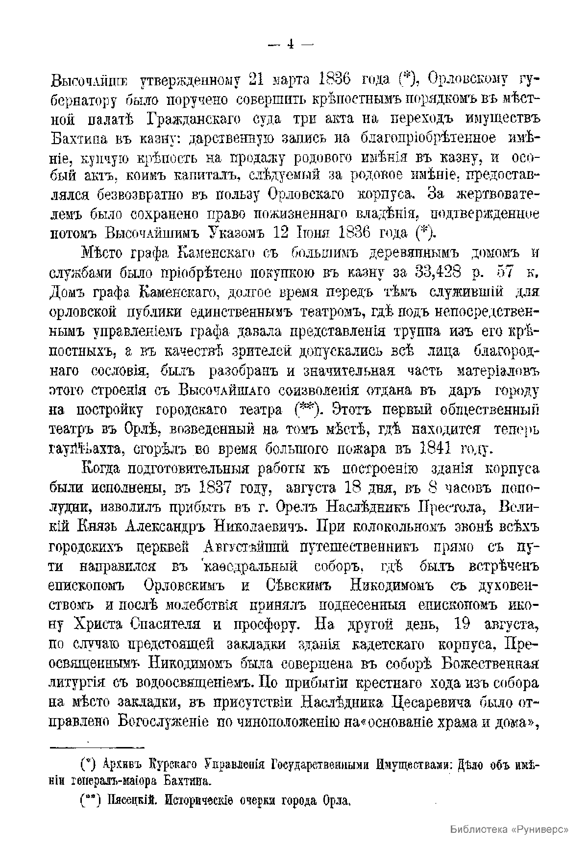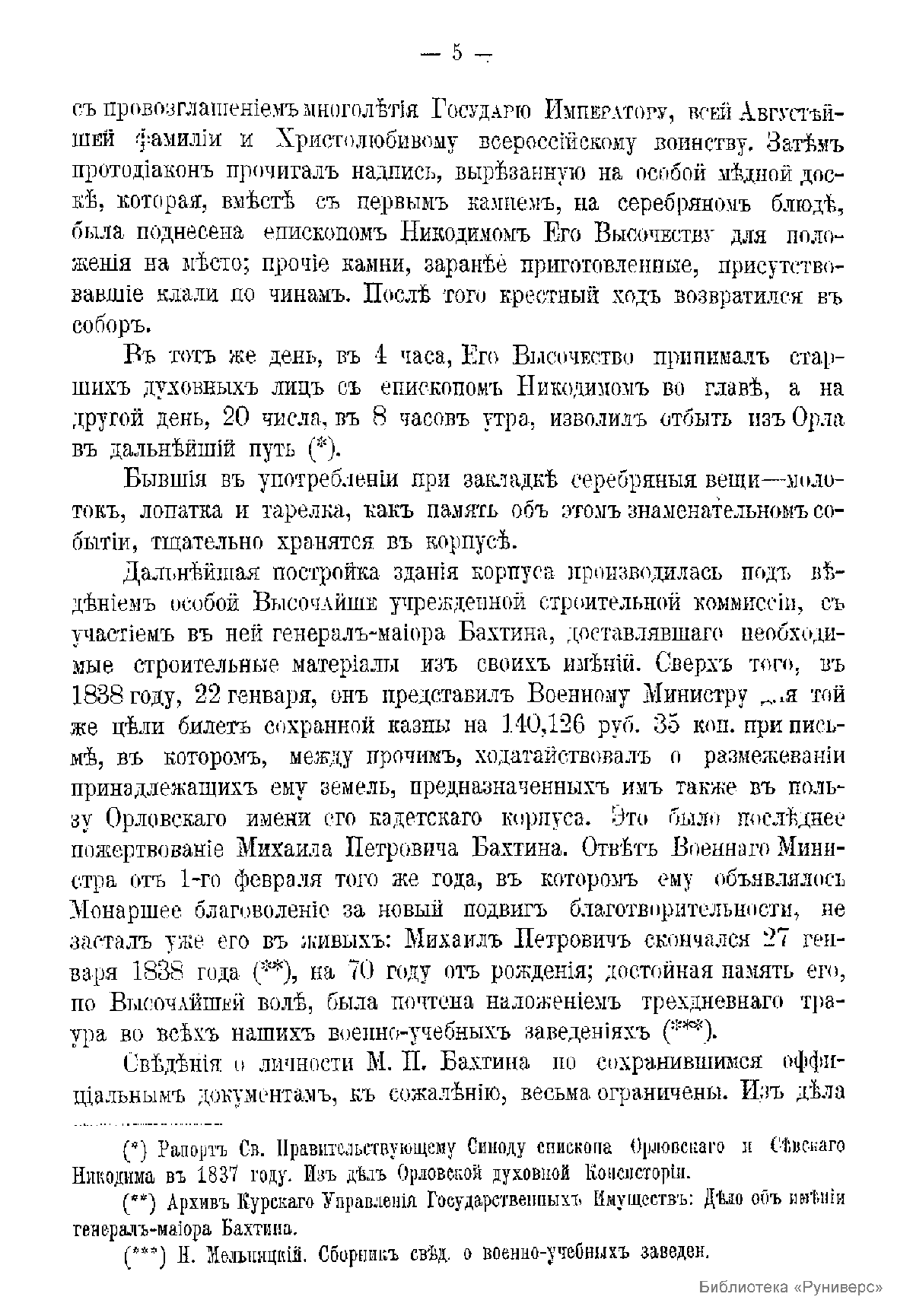 Очерк истории Орловского Бахтина кадетского корпуса был подготовлен в связи с празднованием 50-летия с момента его основания. Автором очерка является известный общественный деятель эпохи реформ Александра II, один из ближайших сотрудников военного министра графа Д.А. Милютина, генерал от артиллерии Матвей Степанович Лалаев, выходец из армянского рода, посвятивший долгие годы жизни организации военного образования в России. Перу этого известного военного ученого принадлежит также двухтомный капитальный труд по истории русских военно-учебных заведений «Исторический очерк военно-учебных заведений, подведомственных Главному их Управлению. От основания в России военных школ до исхода первого двадцатипятилетия благополучного царствования государя императора Александра Николаевича: 1700 – 1880.», изданный в Петербурге в 1880 г. Кадетские корпуса в России, помимо столичного Первого «шляхетского» кадетского корпуса были также организованы и за пределами Санкт-Петербурга, из губернских дворянских училищ, подготавливавших дворянских отпрысков к государственной службе. В 1830 г. было издано «Положение о губернских кадетских корпусах». К этому времени усилился приток денежных средств от провинциального дворянства, к которому еще в 1801 г. обратился Александр I с призывом оказать помощь в создании учебных заведений для детей дворян. В этом же году был составлен проект учреждения для центральных «средних» губерний России кадетского корпуса в г. Туле, где уже существовало Дворянское военное училище, основанное Александром I. Но в 1835 году, один из богатейших брянских и орловских помещиков бездетный полковник в отставке Михаил Петрович Бахтин, бывший командиром Псковского драгунского полка, пожертвовал на учреждение кадетского корпуса в городе Орле капитал в 1.500.000 рублей ассигнациями и имения с 2700 душ крестьян. Император Николай I, принял это пожертвование, повелел новый корпус наименовать «корпусом Бахтина», произвёл Бахтина в чин генерал-майора с зачислением на службу и пожаловал ему орден святого Владимира 2-й степени. В честь щедрого жертвователя была выбита большая золотая медаль с рельефным его изображением и надписью на обороте: «За благотворение юношеству 1836». Впоследствии Бахтин пожертвовал на корпус ещё капитал в 140 тысяч рублей ассигнациями. Затем, по ходатайству Бахтина, его родовое имение было приобретено в казну, и вырученную сумму он передал, по особому акту, Орловскому же кадетскому корпусу. Бахтин скончался 27 января 1838 года, не дожив до открытия кадетского корпуса. На его могиле в селе Барышье Брянского уезда, рядом с построенной им церковью Козьмы и Домиана, был установлен весьма примечательный памятник, увенчанный крестом с фигурой ратника ополчения, на пьедестале выбит текст о пожертвованиях для корпуса. 1 сентября 1837 г. состоялась торжественная церемония закладки основного здания Орловского кадетского корпуса, происходило это в присутствии наследника престола цесаревича – будущего императора Александра II, в то время путешествовавшего по России. 19 декабря 1843 г. корпус был освящен и открыт, и это стало большим событием для города. Четырехэтажное здание корпуса в плане представляло собой букву "Н", являлось самым крупным и красивым в городе, имело в себе церковь, посвященную Архистратигу Михаилу. Еще в мае 1843 г. п