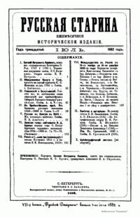«Русская старина», ежемесячный исторический журнал, выходил в Петербурге в 1870-1918. Основан, издавался и редактировался (1870-1892) М. И. Семевским при участии В. И. Семевского. Последующими редакторами были Н. К. Шильдер (1892-1896), Н. Ф. Дубровин (1896-1904), военные историки С. П. Зыков, П. Н. Воронов.