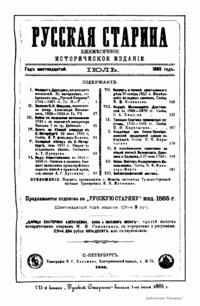 «Русская старина», ежемесячный исторический журнал, выходил в Петербурге в 1870-1918. Основан, издавался и редактировался (1870-1892) М. И. Семевским при участии В. И. Семевского. Последующими редакторами были Н. К. Шильдер (1892-1896), Н. Ф. Дубровин (1896-1904), военные историки С. П. Зыков, П. Н. Воронов.