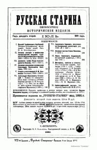 «Русская старина», ежемесячный исторический журнал, выходил в Петербурге в 1870-1918. Основан, издавался и редактировался (1870-1892) М. И. Семевским при участии В. И. Семевского. Последующими редакторами были Н. К. Шильдер (1892-1896), Н. Ф. Дубровин (1896-1904), военные историки С. П. Зыков, П. Н. Воронов.