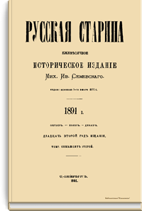 «Русская старина», ежемесячный исторический журнал, выходил в Петербурге в 1870-1918. Основан, издавался и редактировался (1870-1892) М. И. Семевским при участии В. И. Семевского. Последующими редакторами были Н. К. Шильдер (1892-1896), Н. Ф. Дубровин (1896-1904), военные историки С. П. Зыков, П. Н. Воронов.