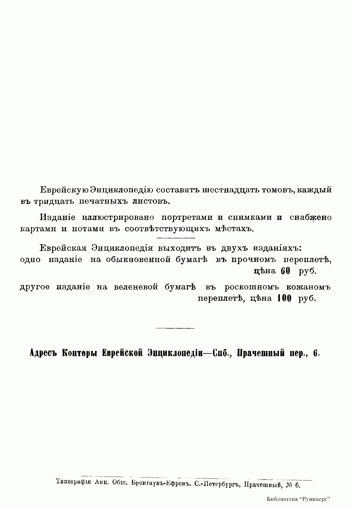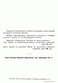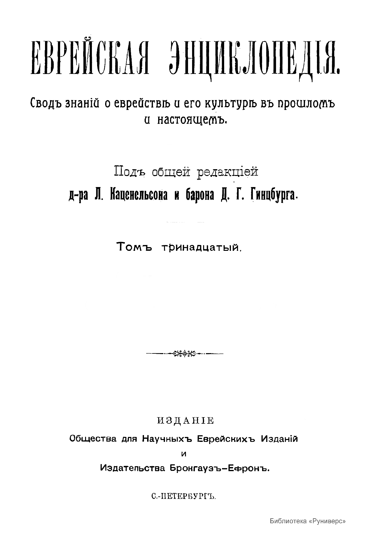 Первый крупный энциклопедический свод знаний о еврействе на русском языке. Энциклопедия была опубликована в 1908 – 1913 гг. в шестнадцати томах в Санкт-Петербурге «Обществом для научных еврейских изданий» и «Издательством Брокгауз – Ефрон». Основой и образцом для нее послужила вышедшая несколько годами ранее двенадцатитомная «The Jewish Encyclopedia» (London; New York, 1901 – 1906). Однако ее материал был существенно дополнен и расширен авторами «Еврейской Энциклопедии Брокгауза» во всем, что касалось истории, культуры и современного положения еврейских общин в Восточной Европе. В работе над «Еврейской энциклопедией Брокгауза» принимали участие виднейшие представители российской иудаики, гебраистики и востоковедения: А.Гаркави, Д. Гинцбург, Ю Гессен, С. Дубнов, И. Маркон, Н. Переферкович. «Еврейская энциклопедия Брокгауза» до сих пор остается одним из важнейших источников справочной информации и статистических данных о почти шестимиллионном еврейском населении Российской империи начала XX в. И потому ее данные можно отнести к числу ценных источников сведений по социально-политической, этнической, культурно-религиозной истории и исторической демографии России и сопредельных ей стран.