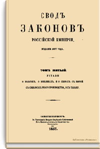 Сводъ законовъ Россiйской имперiи. Томъ пятый. Уставы о податяхъ, о пошлинахъ, и о сборахъ съ питей, с свеклосахарнаго производства, и съ табаку