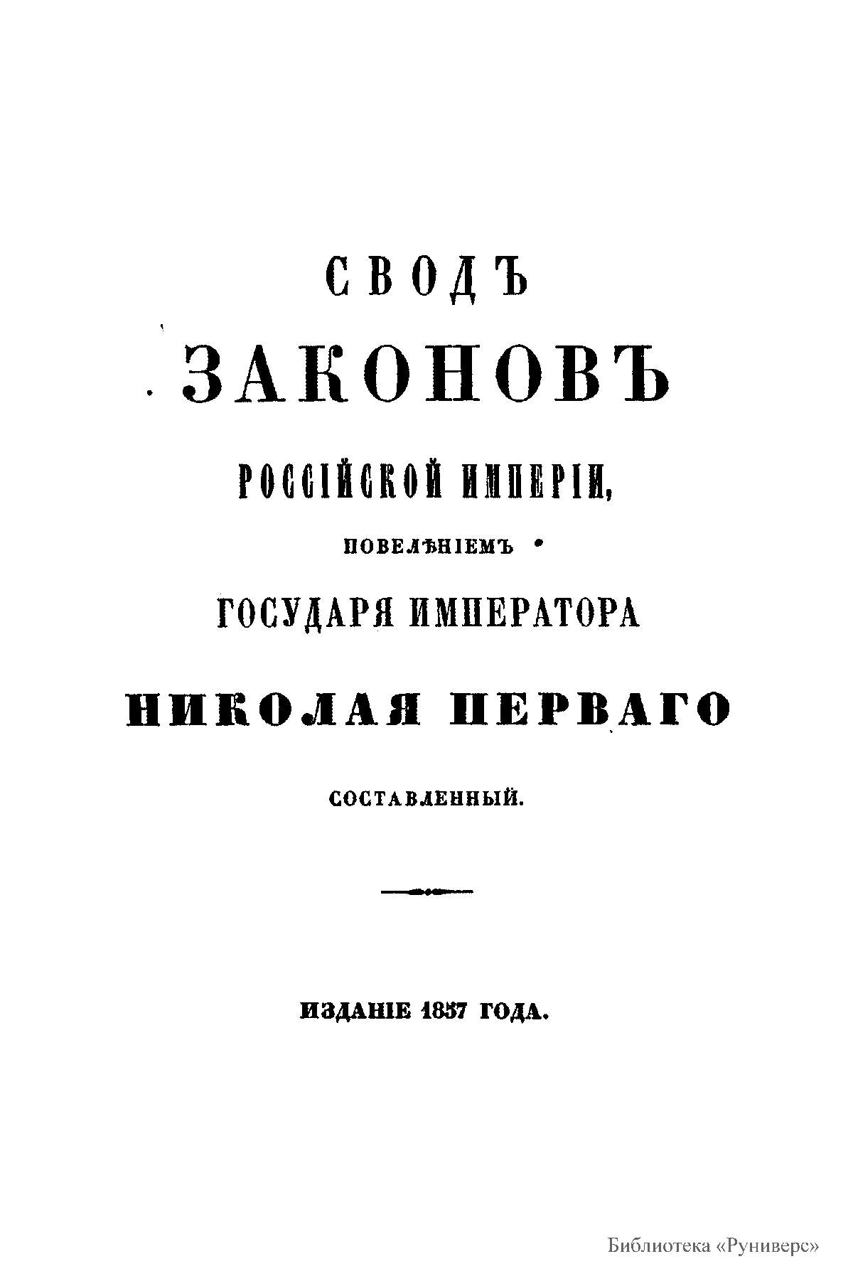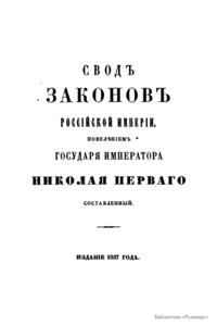 Свод законов Российской империи— официальное собрание расположенных в тематическом порядке действующих законодательных актов Российской империи, созданное при Николае I. Впервые он был напечатан в 1832 году. Манифестом 31 января 1833 года Свод законов был объявлен действующим источником права с 1 января 1835 года. Первое издание 1832 года и последующие 1842-го и 1857 года состояли из пятнадцати томов. После 1857 года Свод законов полностью не переиздавался, а выходили лишь отдельные тома. В качестве отдельного – 16-го тома в 1885 году вышли Судебные уставы. Между изданиями Свода законов выходили ежегодные и сводные (за несколько лет) «Продолжения» Свода законов с указанием на упраздненные и измененные статьи. В своде законов собраны все реально действовавшие в определенный момент времени законы по тем или иным проблемам права, это справочник для юристов. Отбор законодательного материала для включения в Свод производился на основе Полного собрания законов (первое Полное собрание законов, появившееся в 1830 году, состояло из 45 томов, содержащих 30 920 актов и 6 томов приложений). Собрание законов – это в большой степени историческое издание. По нему можно изучать развитие, направление правительственной мысли в стране. Это летопись отечественного законотворчества. Изучая страницу за страницей эту летопись, мы можем узнать, что в тот или иной момент истории являлось злобой дня.