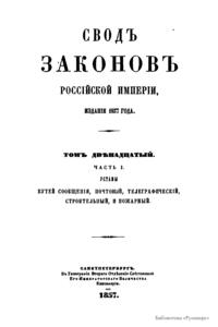 Свод законов Российской империи. Том двенадцатый. Часть I. Уставы путей сообщения, почтовый, телеграфический, строительный, и пожарный