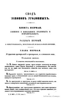 Свод законов Российской империи— официальное собрание расположенных в тематическом порядке действующих законодательных актов Российской империи, созданное при Николае I. Впервые он был напечатан в 1832 году. Манифестом 31 января 1833 года Свод законов был объявлен действующим источником права с 1 января 1835 года. Первое издание 1832 года и последующие 1842-го и 1857 года состояли из пятнадцати томов. После 1857 года Свод законов полностью не переиздавался, а выходили лишь отдельные тома. В качестве отдельного – 16-го тома в 1885 году вышли Судебные уставы. Между изданиями Свода законов выходили ежегодные и сводные (за несколько лет) «Продолжения» Свода законов с указанием на упраздненные и измененные статьи. В своде законов собраны все реально действовавшие в определенный момент времени законы по тем или иным проблемам права, это справочник для юристов. Отбор законодательного материала для включения в Свод производился на основе Полного собрания законов (первое Полное собрание законов, появившееся в 1830 году, состояло из 45 томов, содержащих 30 920 актов и 6 томов приложений). Собрание законов – это в большой степени историческое издание. По нему можно изучать развитие, направление правительственной мысли в стране. Это летопись отечественного законотворчества. Изучая страницу за страницей эту летопись, мы можем узнать, что в тот или иной момент истории являлось злобой дня.