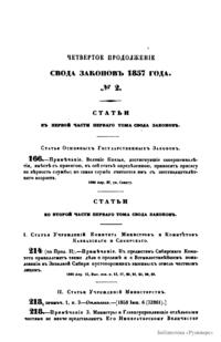 Свод законов Российской империи— официальное собрание расположенных в тематическом порядке действующих законодательных актов Российской империи, созданное при Николае I. Впервые он был напечатан в 1832 году. Манифестом 31 января 1833 года Свод законов был объявлен действующим источником права с 1 января 1835 года. Первое издание 1832 года и последующие 1842-го и 1857 года состояли из пятнадцати томов. После 1857 года Свод законов полностью не переиздавался, а выходили лишь отдельные тома. В качестве отдельного – 16-го тома в 1885 году вышли Судебные уставы. Между изданиями Свода законов выходили ежегодные и сводные (за несколько лет) «Продолжения» Свода законов с указанием на упраздненные и измененные статьи. В своде законов собраны все реально действовавшие в определенный момент времени законы по тем или иным проблемам права, это справочник для юристов. Отбор законодательного материала для включения в Свод производился на основе Полного собрания законов (первое Полное собрание законов, появившееся в 1830 году, состояло из 45 томов, содержащих 30 920 актов и 6 томов приложений). Собрание законов – это в большой степени историческое издание. По нему можно изучать развитие, направление правительственной мысли в стране. Это летопись отечественного законотворчества. Изучая страницу за страницей эту летопись, мы можем узнать, что в тот или иной момент истории являлось злобой дня.