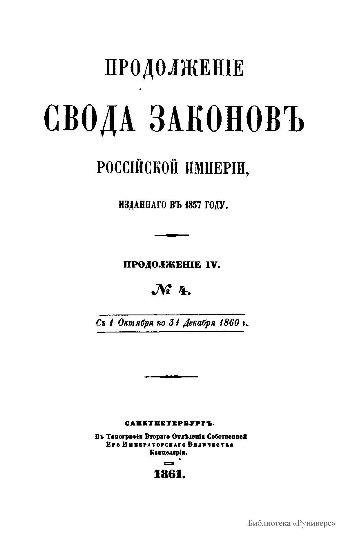 Продолженiе свода законовъ Россiйской имперiи, изданнаго въ 1857 году. Продолженiе №IV. №4. Съ 1 октября по 31 декабря 1860 года