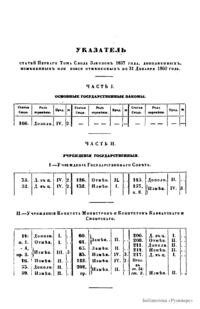 Свод законов Российской империи— официальное собрание расположенных в тематическом порядке действующих законодательных актов Российской империи, созданное при Николае I. Впервые он был напечатан в 1832 году. Манифестом 31 января 1833 года Свод законов был объявлен действующим источником права с 1 января 1835 года. Первое издание 1832 года и последующие 1842-го и 1857 года состояли из пятнадцати томов. После 1857 года Свод законов полностью не переиздавался, а выходили лишь отдельные тома. В качестве отдельного – 16-го тома в 1885 году вышли Судебные уставы. Между изданиями Свода законов выходили ежегодные и сводные (за несколько лет) «Продолжения» Свода законов с указанием на упраздненные и измененные статьи. В своде законов собраны все реально действовавшие в определенный момент времени законы по тем или иным проблемам права, это справочник для юристов. Отбор законодательного материала для включения в Свод производился на основе Полного собрания законов (первое Полное собрание законов, появившееся в 1830 году, состояло из 45 томов, содержащих 30 920 актов и 6 томов приложений). Собрание законов – это в большой степени историческое издание. По нему можно изучать развитие, направление правительственной мысли в стране. Это летопись отечественного законотворчества. Изучая страницу за страницей эту летопись, мы можем узнать, что в тот или иной момент истории являлось злобой дня.