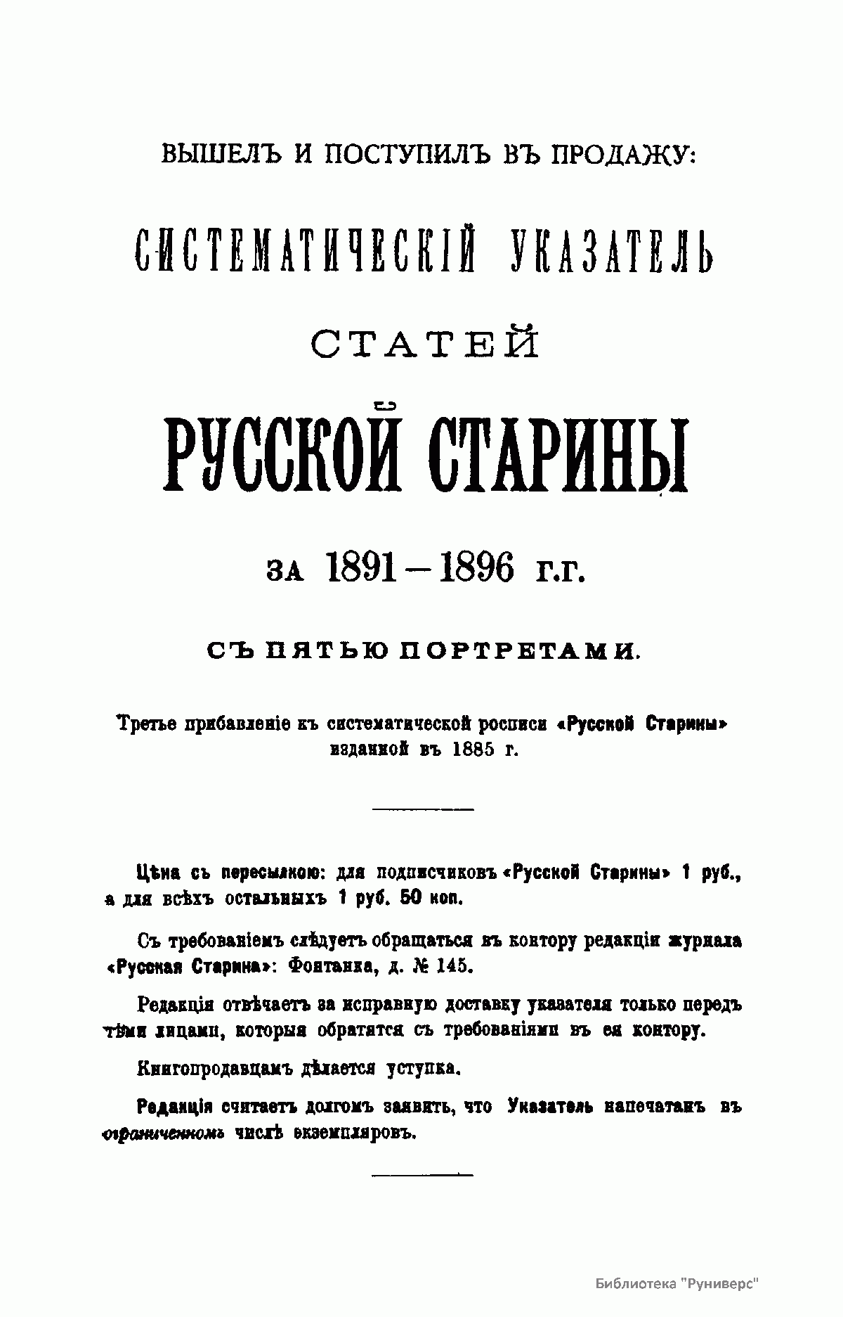«Русская старина», ежемесячный исторический журнал, выходил в Петербурге в 1870-1918. Основан, издавался и редактировался (1870-1892) М. И. Семевским при участии В. И. Семевского. Последующими редакторами были Н. К. Шильдер (1892-1896), Н. Ф. Дубровин (1896-1904), военные историки С. П. Зыков, П. Н. Воронов.