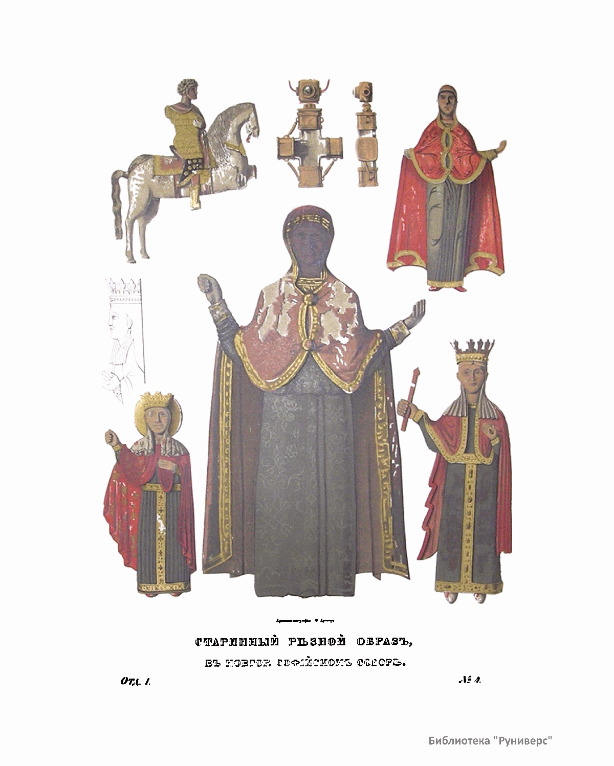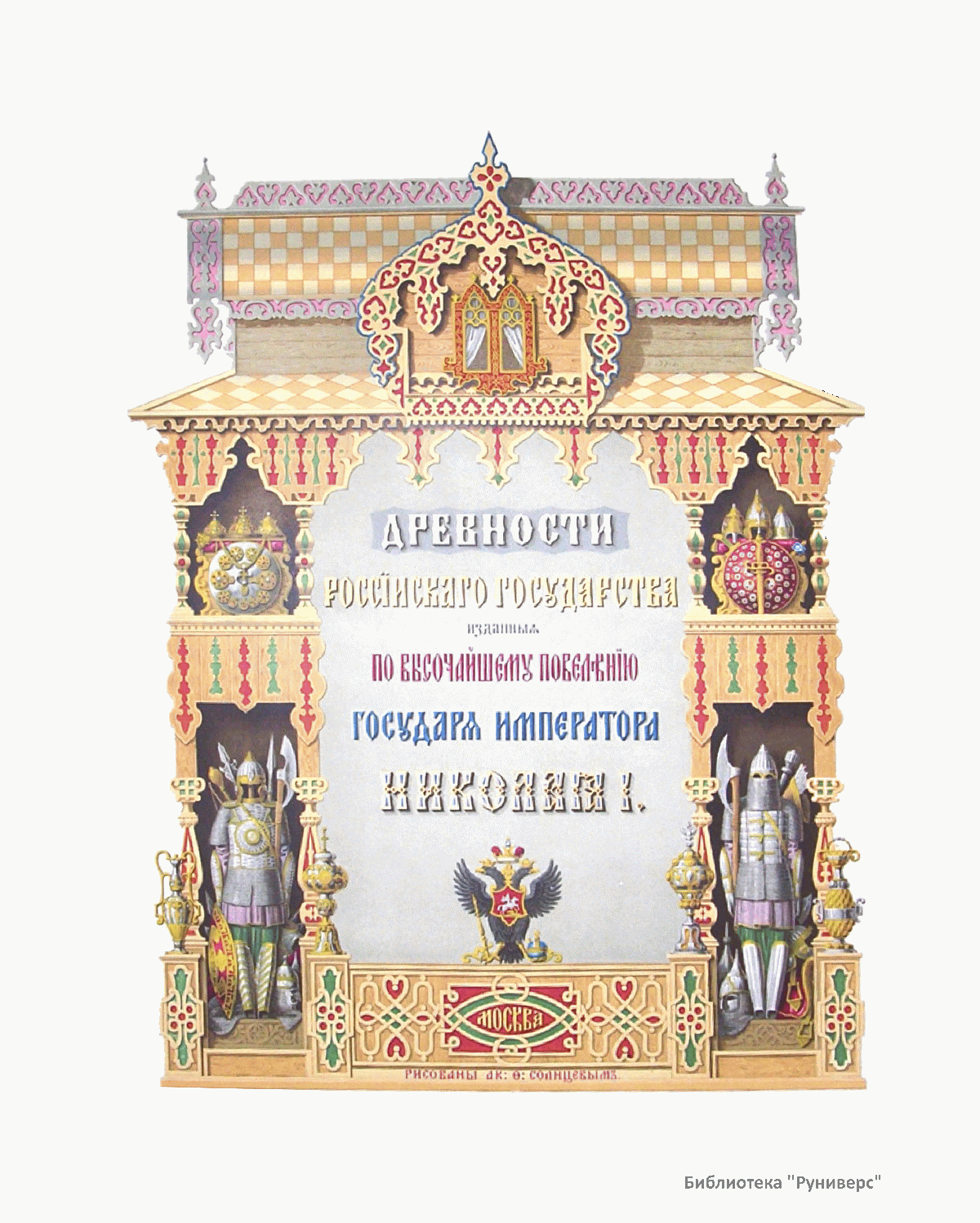 Авторы настоящего издания считают, что время охранения памятников России настало со вступления на престол Императора Николая I. Повелевая хранить памятники и остатки русских древностей, он приказал все, что заслуживает внимание и составляет материал истории, отчетливо срисовать, описать и издать. Император повелел учредить в Москве Комитет издания древностей Российского государства. Первый отдел огромного и великолепного издания «Древности Российского государства» состоит из 500 большого формата рисунков, распределенных по своему содержанию на шесть частей с соответствующим описанием. Первая часть «Древностей» заключает в себе священные памятники: а) образа и кресты, замечательные в историческом и художественном отношении, б) храмовую утварь разных времен, в) облачения духовного сана. Вторая часть содержит древний царский чин, или священное облачение русских великих князей и царей при поставлении на царство. В третьей части представлена древняя броня и оружие. Четвертую часть составляют древние великокняжеские, царские, боярские и местные народные одежды в изображениях и портретах. В пятой части можно увидеть древнюю царскую столовую утварь. Шестая часть состоит из памятников древнего русского зодчества.