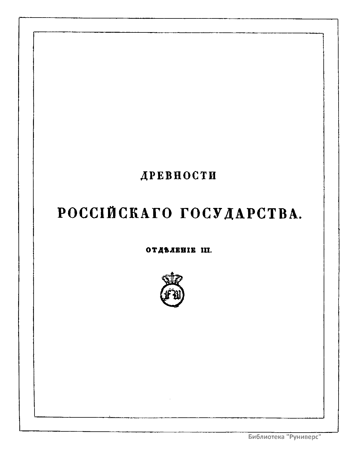 Авторы настоящего издания считают, что время охранения памятников России настало со вступления на престол Императора Николая I. Повелевая хранить памятники и остатки русских древностей, он приказал все, что заслуживает внимание и составляет материал истории, отчетливо срисовать, описать и издать. Император повелел учредить в Москве Комитет издания древностей Российского государства. Первый отдел огромного и великолепного издания «Древности Российского государства» состоит из 500 большого формата рисунков, распределенных по своему содержанию на шесть частей с соответствующим описанием. Первая часть «Древностей» заключает в себе священные памятники: а) образа и кресты, замечательные в историческом и художественном отношении, б) храмовую утварь разных времен, в) облачения духовного сана. Вторая часть содержит древний царский чин, или священное облачение русских великих князей и царей при поставлении на царство. В третьей части представлена древняя броня и оружие. Четвертую часть составляют древние великокняжеские, царские, боярские и местные народные одежды в изображениях и портретах. В пятой части можно увидеть древнюю царскую столовую утварь. Шестая часть состоит из памятников древнего русского зодчества.