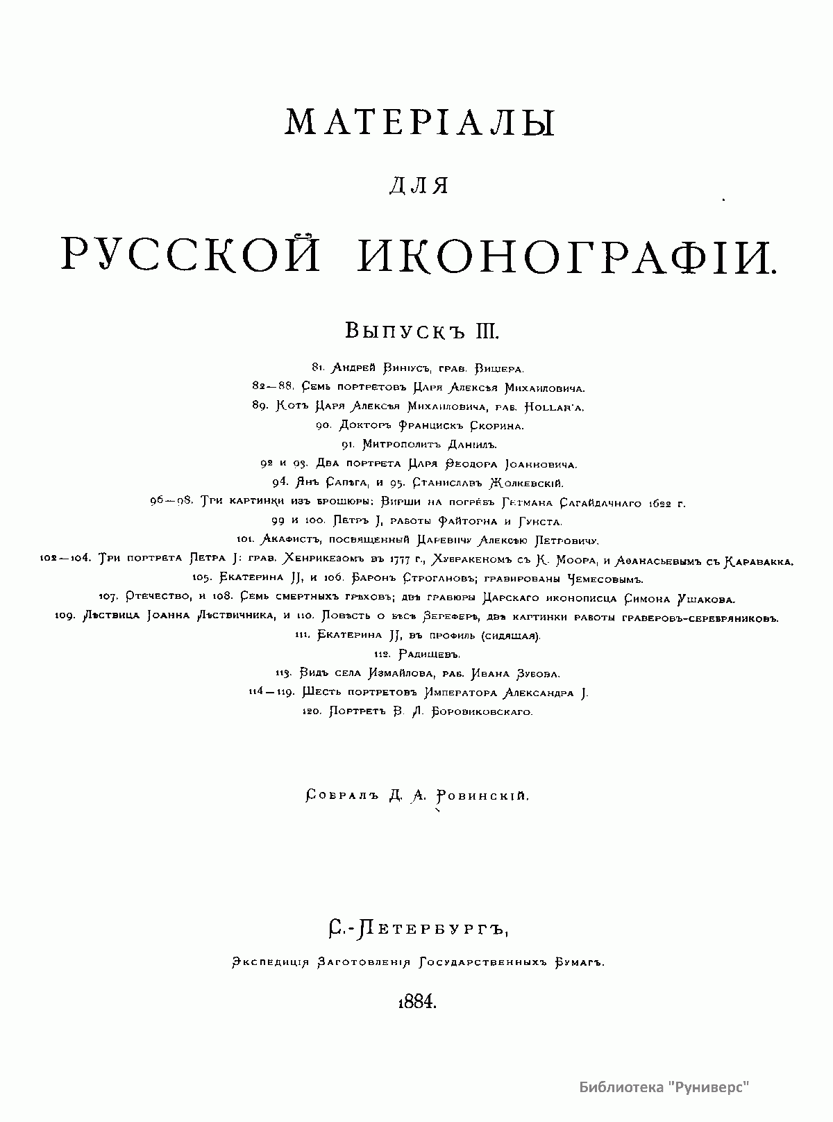 В 1882 г. Д. Ровинский издал книгу «Достоверные портреты московских государей: Ивана III, Василия Ивановича и Ивана IV Грозного – и посольства их времени». Это исследование составляло первый отдел предпринятой автором русской иконографии. За ним должны были следовать другие отделы. Материалов для каждого из этих отделов накопилось довольно много, но тем не менее существовали еще значительные пробелы, которые не позволяли приступить к систематическому изданию. Но так как любители и собиратели старины настаивали на издании, автор приступил к предварительной публикации собранных им снимков под общим названием «Материалы для русской иконографии». В эти материалы вошли портреты, виды, исторические и бытовые листы, листы, изготовленные для истории русской гравюры, работы граверов-серебряников, а также отпечатки с оригинальных старинных медных досок. Все снимки, за немногим исключением, сделаны в одну меру с оригиналами. Самые замечательные и редкие исполнены на меди по способу Г. Скамони, или печатаны со стекла посредством альбертотипии (у Шера и Набгольца в Москве и за границей) и фотогиалотипии (у г. Скамони); менее редкие и важные картинки исполнены посредством фотолитографии.