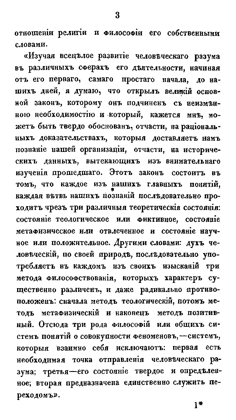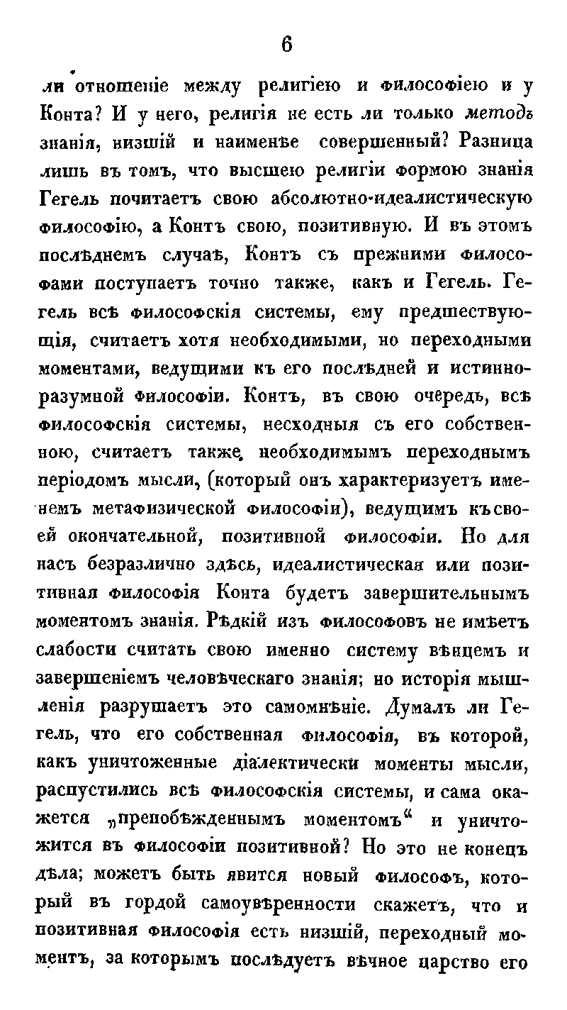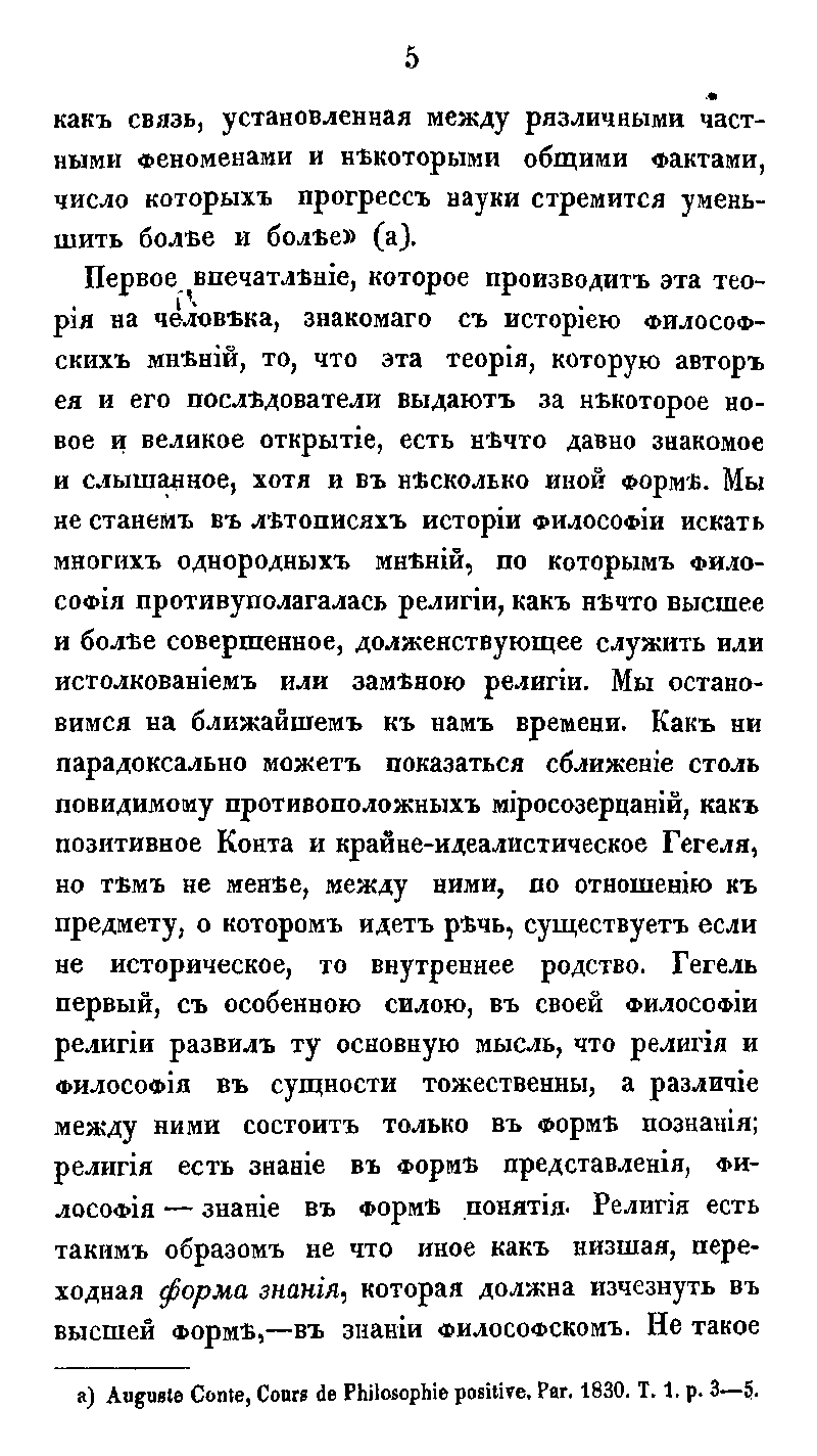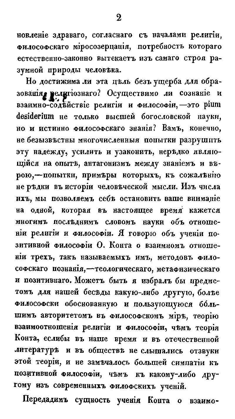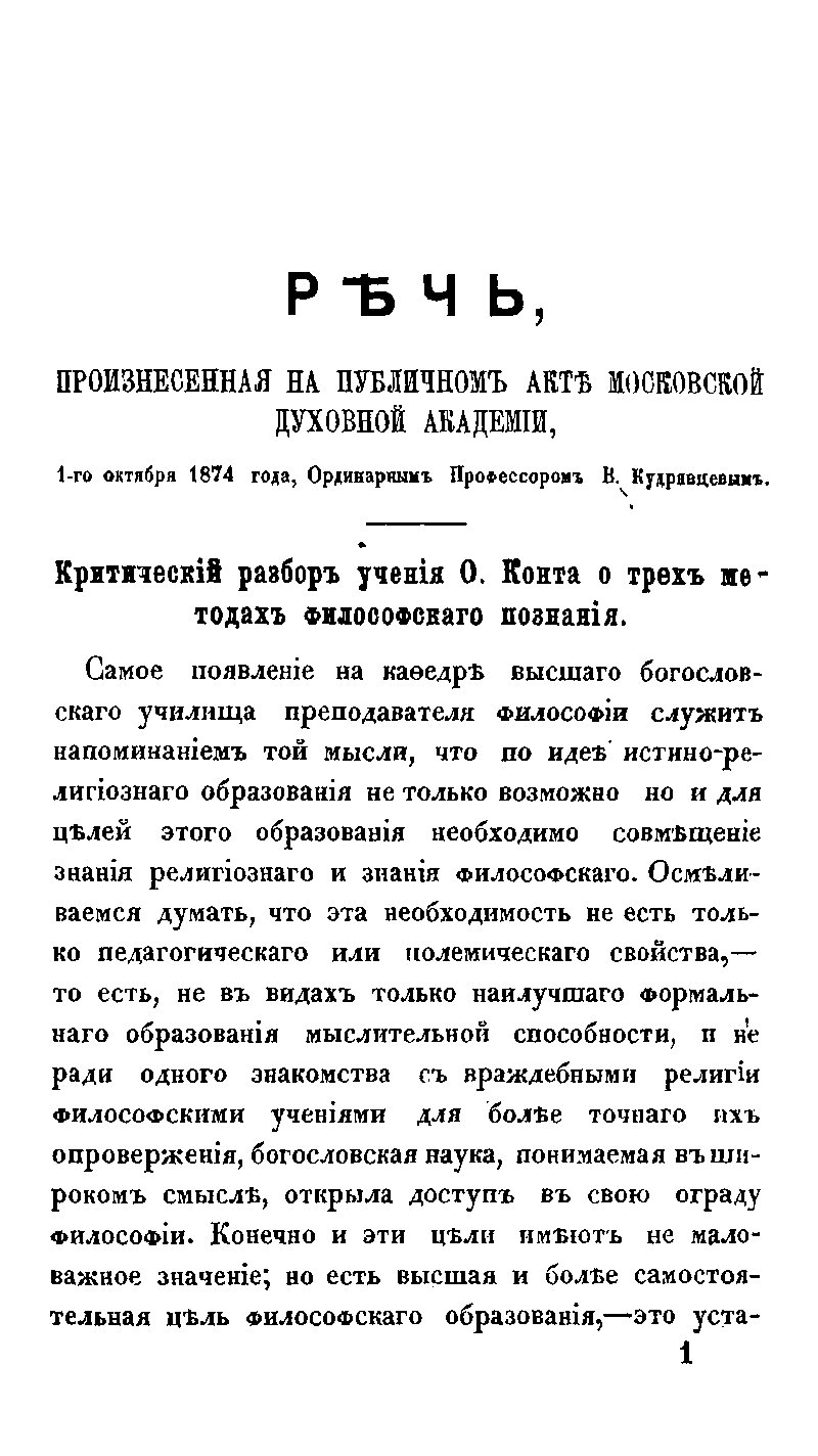 Свою речь в Московской духовной академии 1 октября 1874 года создатель системы трансцендентального монизма, один из видных представителей школы московского теизма, ученик Ф. А. Голубинского ординарный профессор Виктор Дмитриевич Кудрявцев-Платонов посвящает критическому разбору учения Огюста Конта. Он определяет высшую и самостоятельную цель философии, которая состоит в установлении «здравого, согласного с началами религии философского миросозерцания, потребность которого естественно-законно вытекает из самого строя разумной природы человека».
