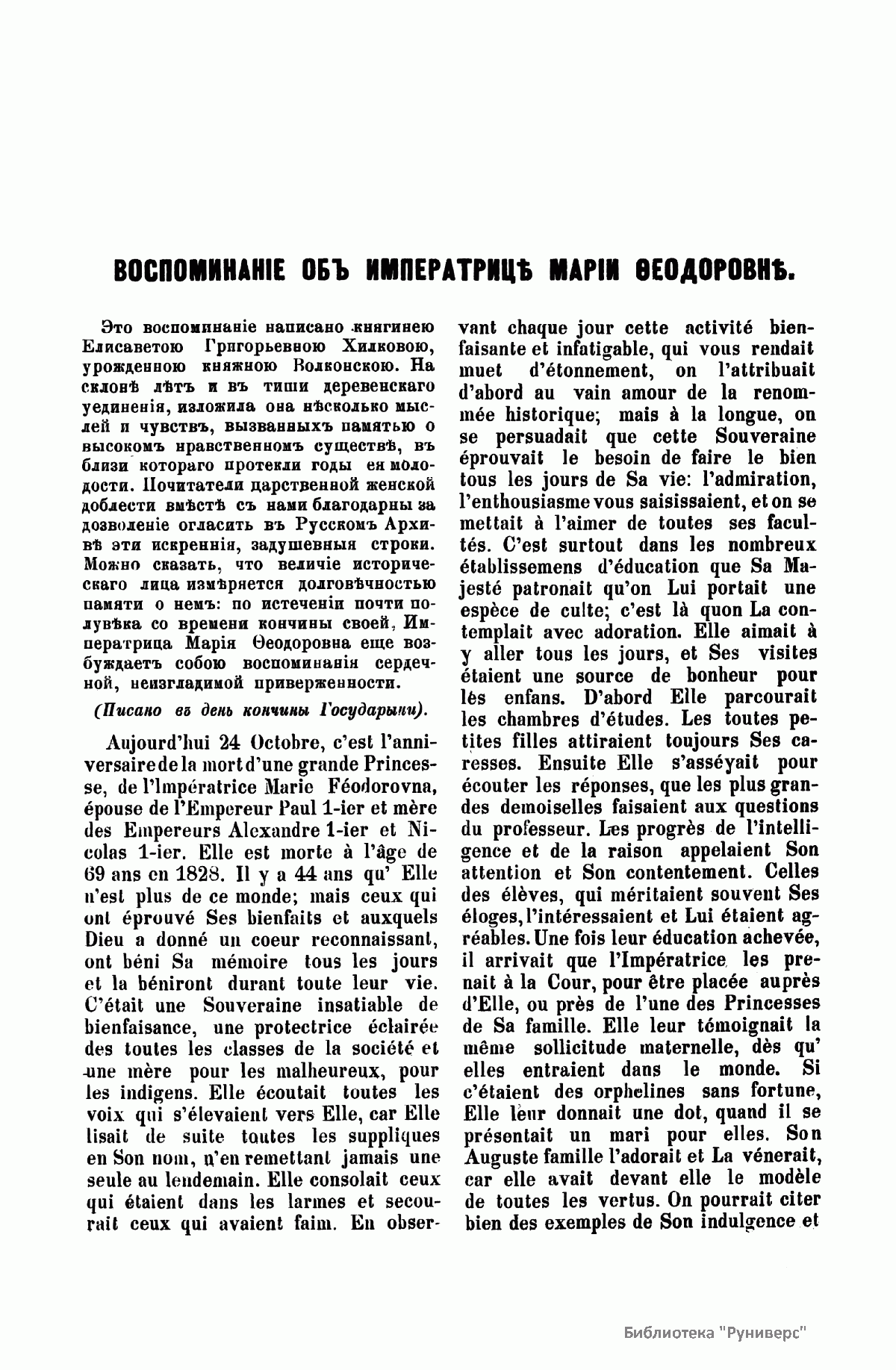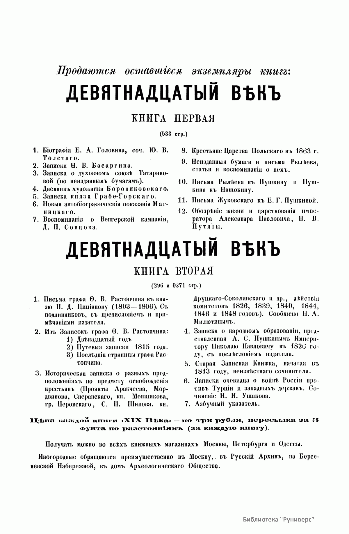 «Русский архив» — ежемесячный историко-литературный журнал, издававшийся в Москве с 1863 по 1917 год. Создателем и продолжительные годы редактором журнала был П. И. Бартенев – историк, археограф, библиограф. Этот журнал называли «живой картиной былого», поскольку он содержал преимущественно публикации неизданных мемуарных, эпистолярных, литературно-художественных и ведомственных документальных материалов, освещавших культурную и политическую историю России в XVIII и XIX вв. По числу опубликованных источников «Русский архив» стоит на первом месте среди русских исторических журналов.