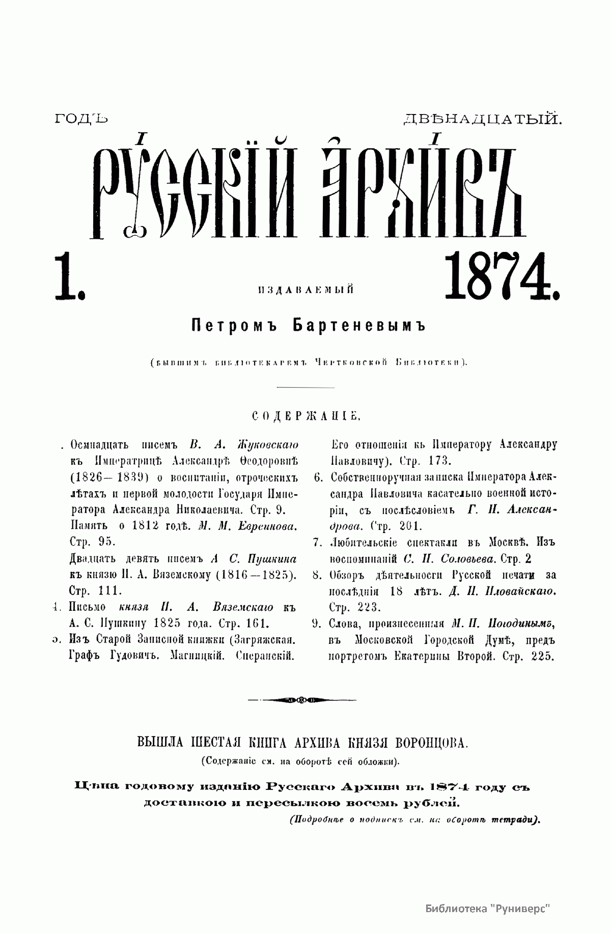 Когда известный граф М. С. Воронцов пригласил П. И. Бартенева издать семейный архив Воронцовых, историк познакомился с его женой, Елизаветой Ксаверьевной, услышал от нее много интересных рассказов о Пушкине. Впоследствии в разных журналах, в том числе и в «Русском архиве» были опубликованы статьи П. И. Бартенева, посвященные Пушкину, которые легли в основу будущих исследований пушкинистов, биографов, краеведов, изучавших его творчество. На страницах журнала были опубликованы произведения русских писателей и поэтов: В. А. Жуковского М. Ю. Лермонтова, Н. М. Карамзина, Н. В. Гоголя. Среди редких исторических документов в «Русском архиве» были опубликованы материалы об Отечественной войне 1812 года (1890), записки и письма декабристов (во многих книжках «Русского архива» различных годов).