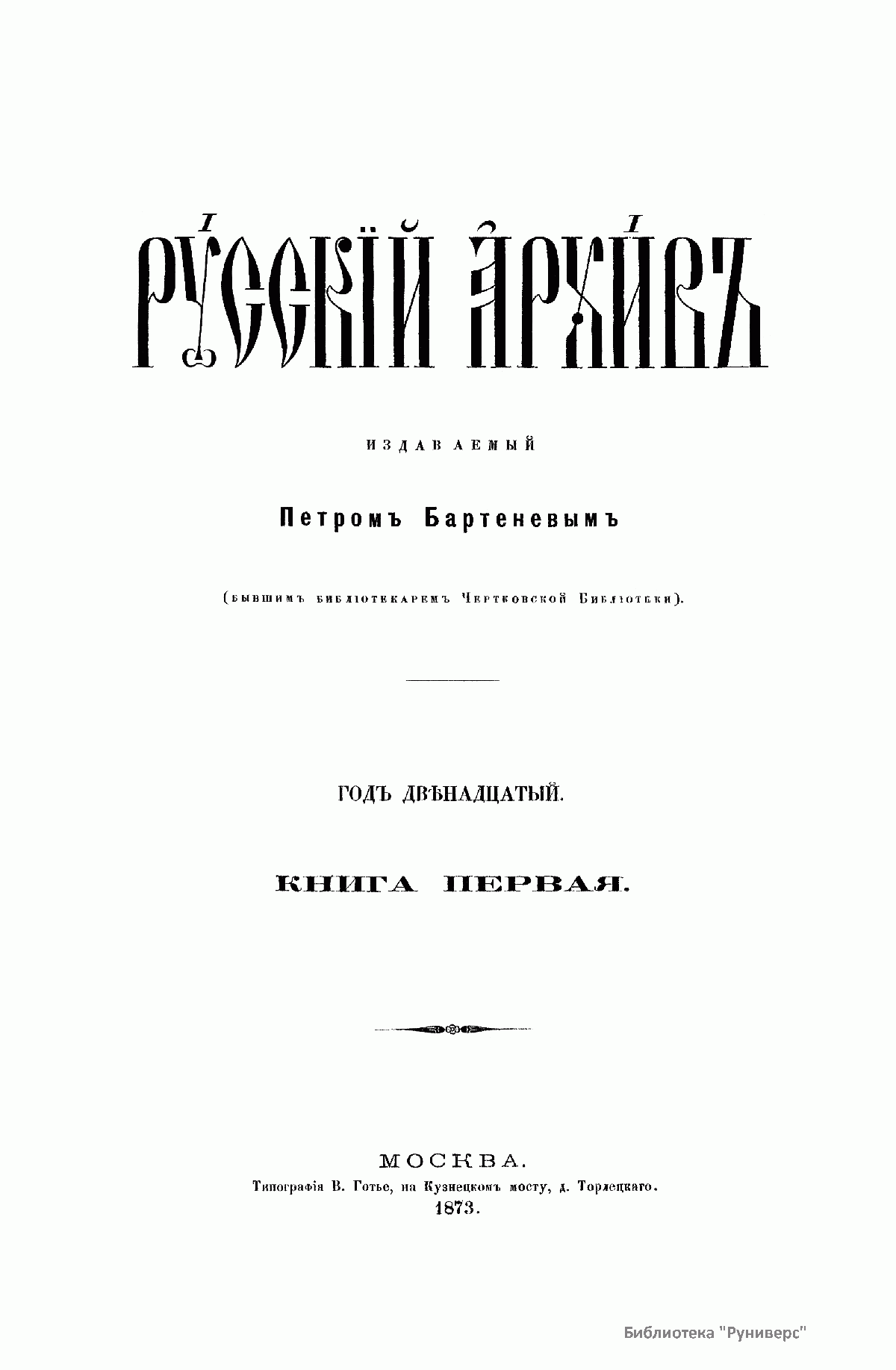 «Русский архив» — ежемесячный историко-литературный журнал, издававшийся в Москве с 1863 по 1917 год. Создателем и продолжительные годы редактором журнала был П. И. Бартенев – историк, археограф, библиограф. Этот журнал называли «живой картиной былого», поскольку он содержал преимущественно публикации неизданных мемуарных, эпистолярных, литературно-художественных и ведомственных документальных материалов, освещавших культурную и политическую историю России в XVIII и XIX вв. По числу опубликованных источников «Русский архив» стоит на первом месте среди русских исторических журналов.
