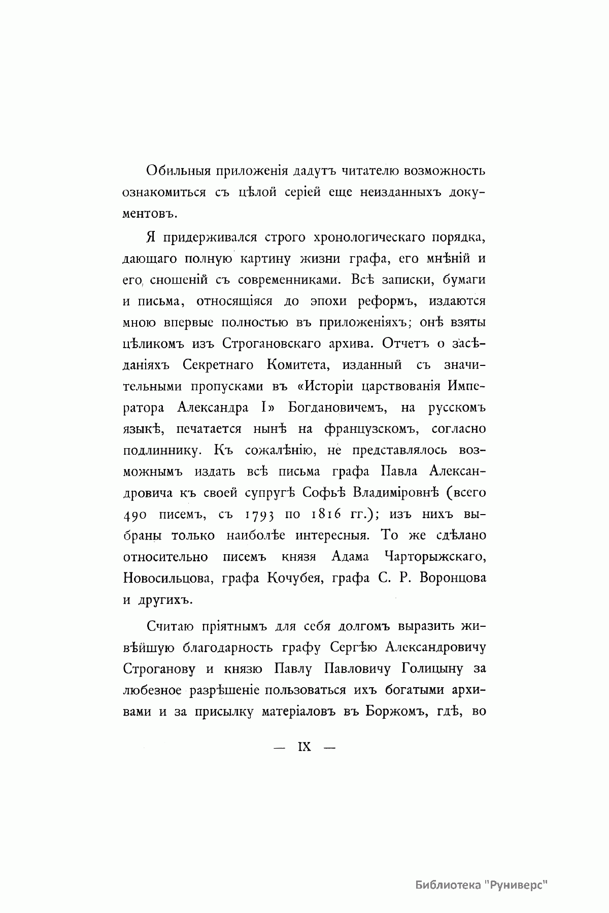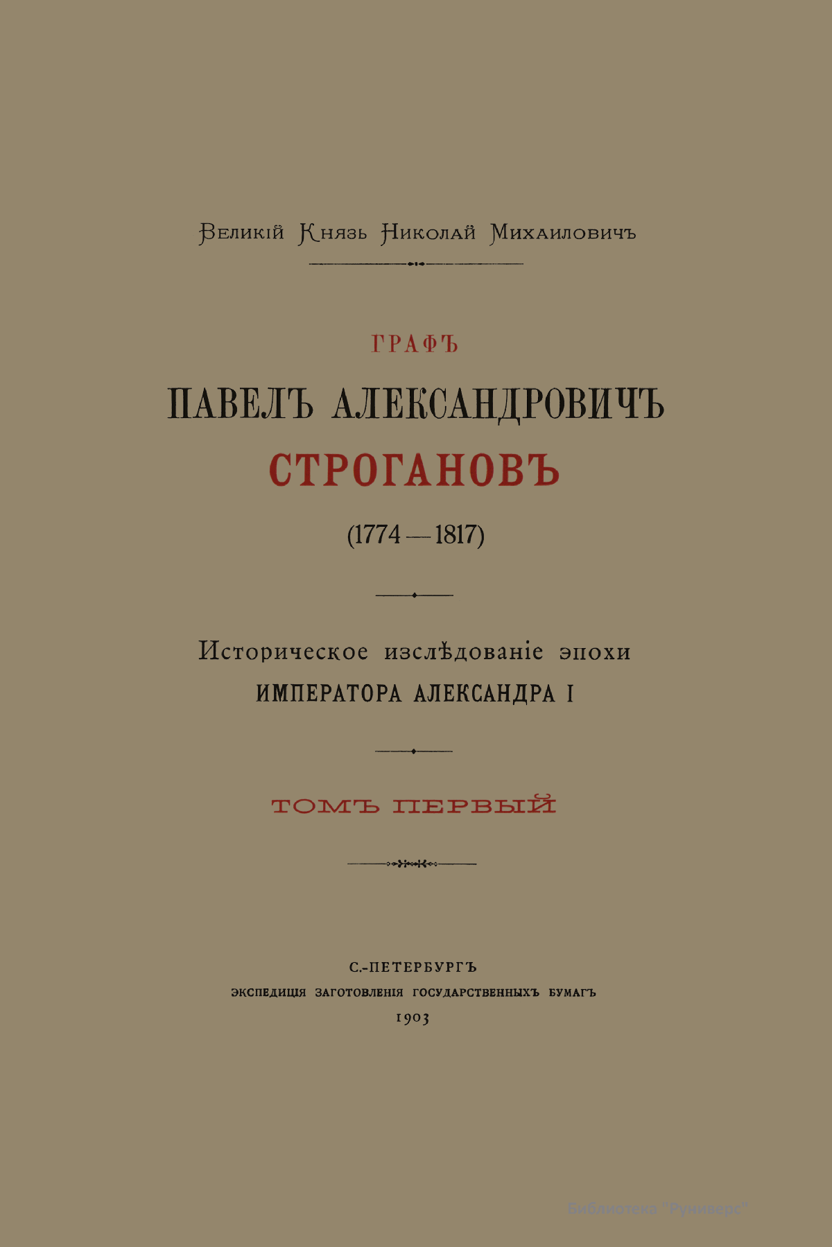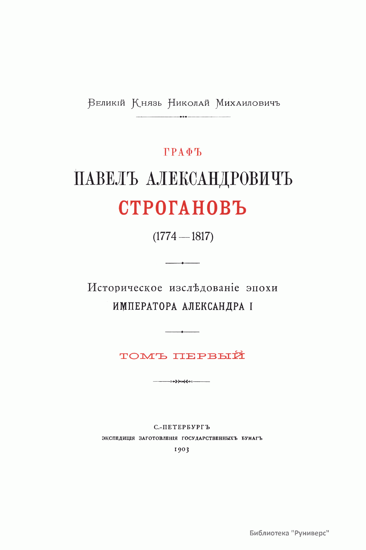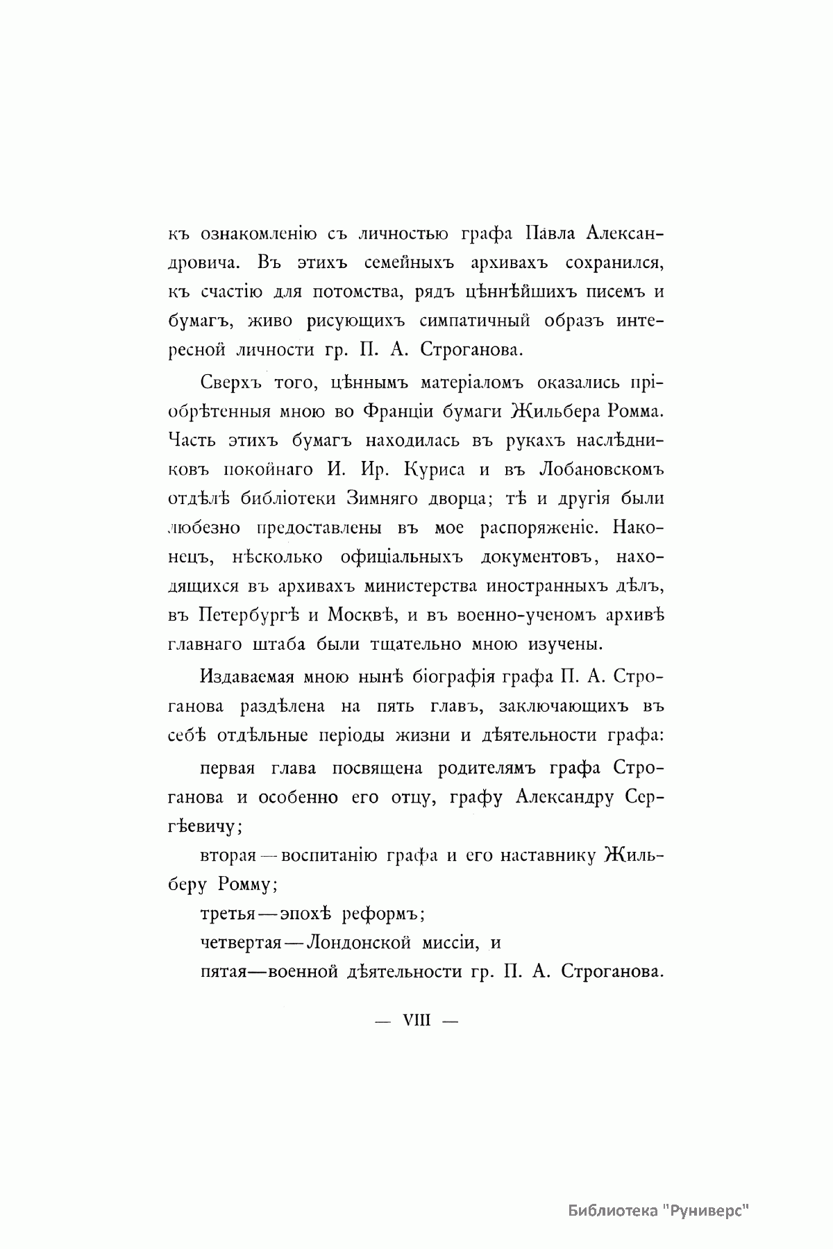 Данное историческое исследование великого князя Николая Михайловича дает наиболее полное представление о жизни и деятельности графа Строганова. Представленная биография разделена на пять глав, освещающих отдельные периоды его жизни и деятельности. Первая глава посвящена родителям графа Строганова и особенно его отцу, графу Александру Сергеевичу; вторая – воспитанию графа и его наставнику; третья – эпохе «Комитета общественной безопасности»; четвертая – лондонской миссии; пятая – военной деятельности. В издании помещены многочисленные приложения, дающие возможность ознакомиться с целой серией не изданных до того времени документов.