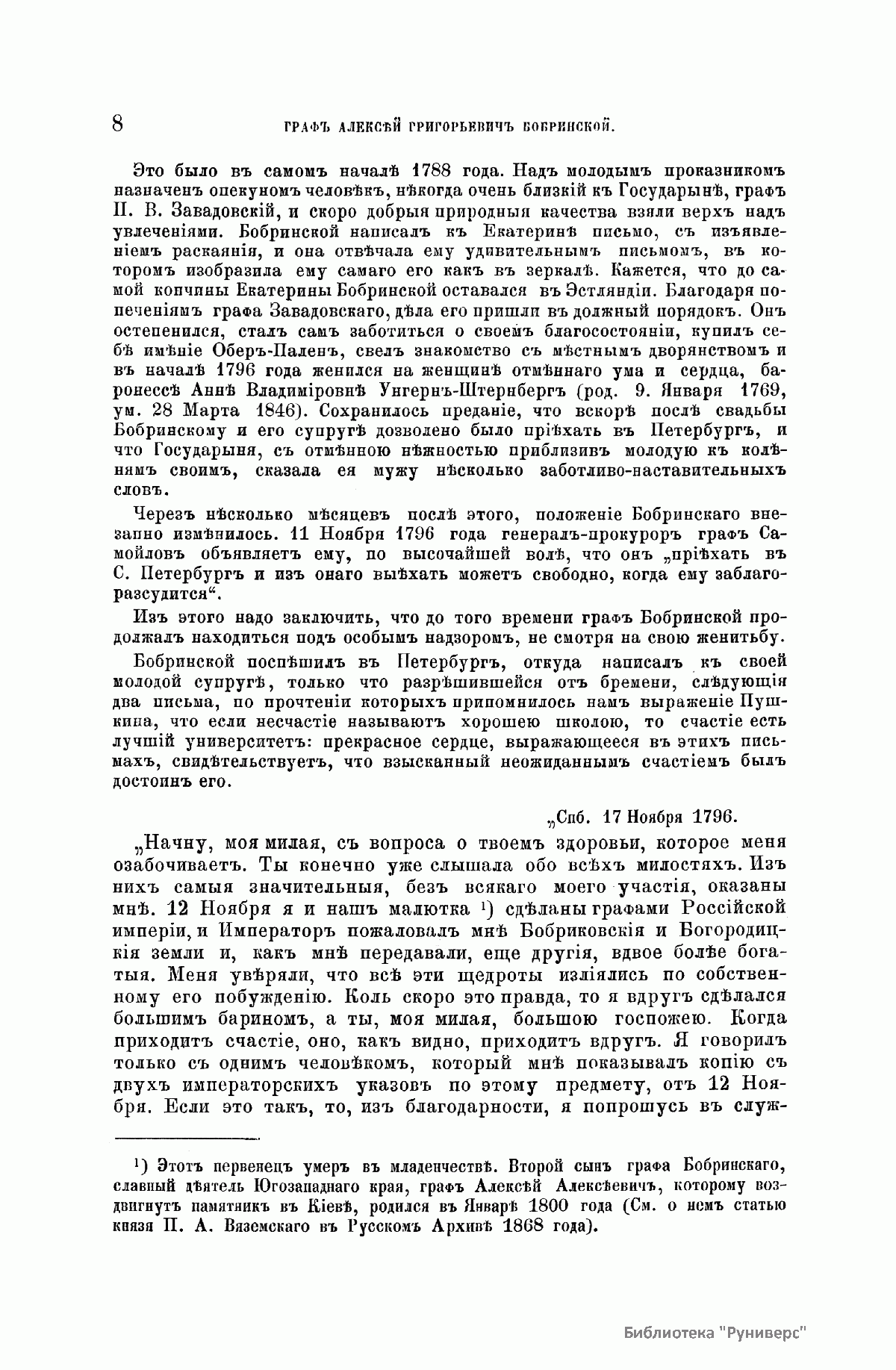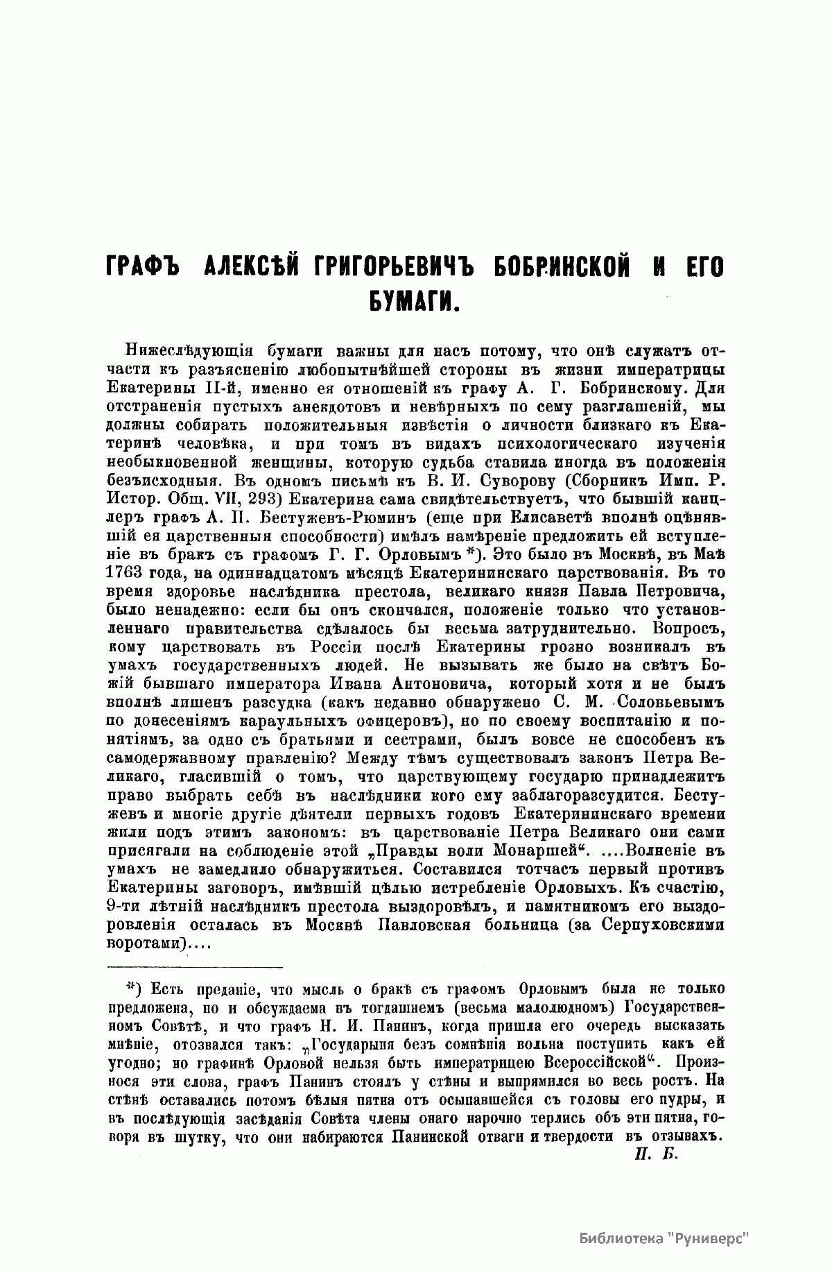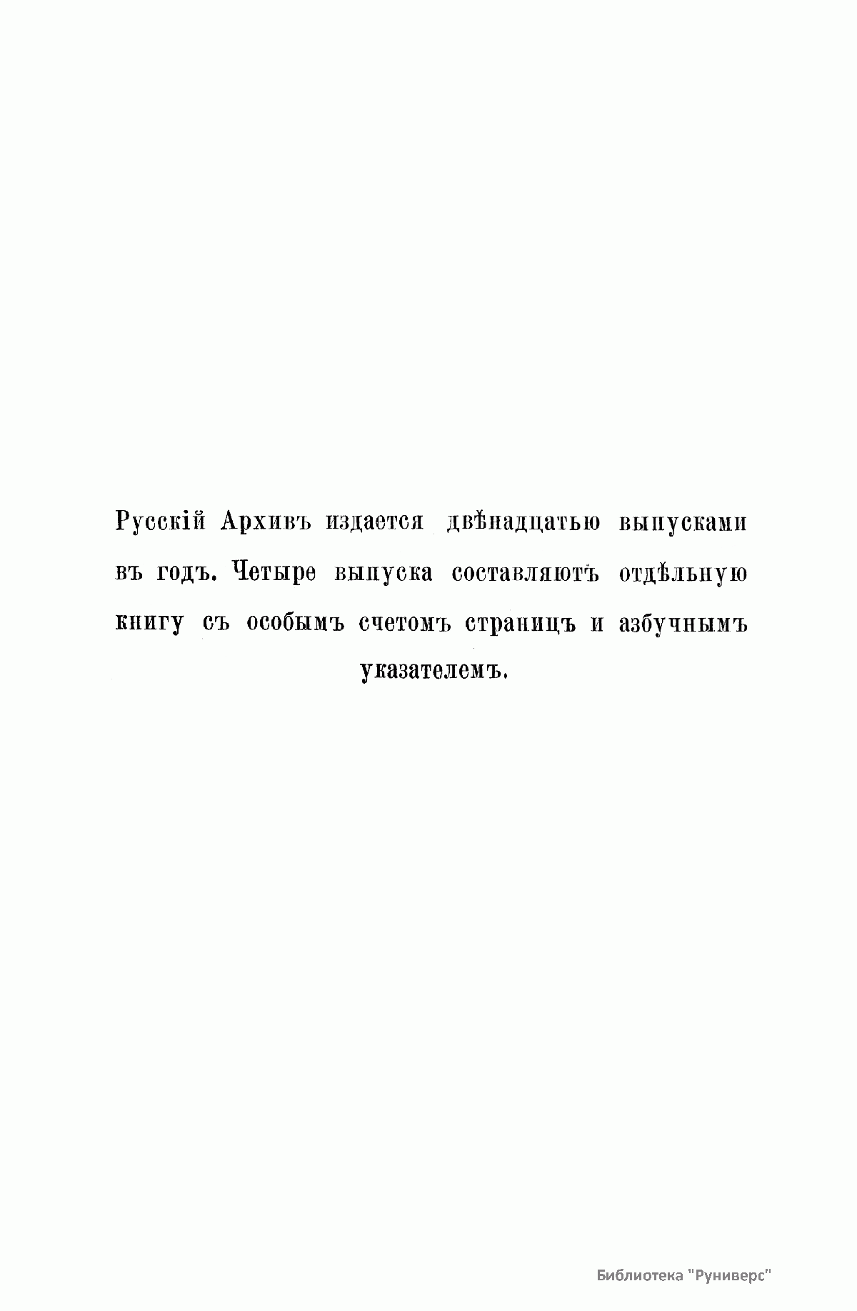 «Русский архив» — ежемесячный историко-литературный журнал, издававшийся в Москве с 1863 по 1917 год. Создателем и продолжительные годы редактором журнала был П. И. Бартенев – историк, археограф, библиограф. Этот журнал называли «живой картиной былого», поскольку он содержал преимущественно публикации неизданных мемуарных, эпистолярных, литературно-художественных и ведомственных документальных материалов, освещавших культурную и политическую историю России в XVIII и XIX вв. По числу опубликованных источников «Русский архив» стоит на первом месте среди русских исторических журналов.