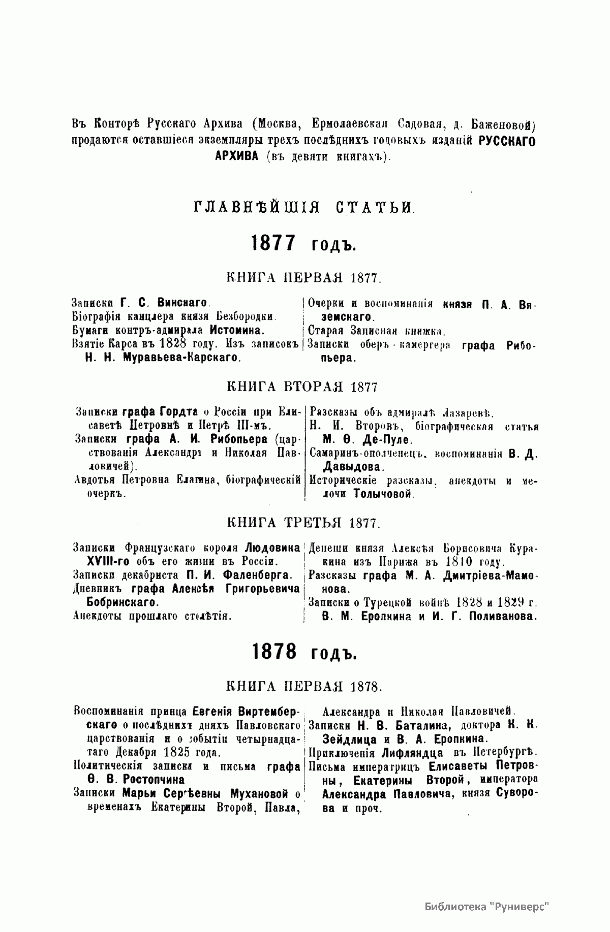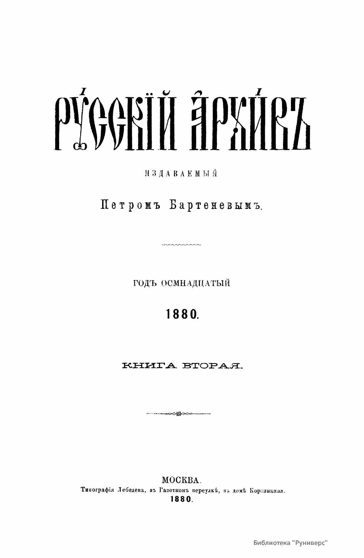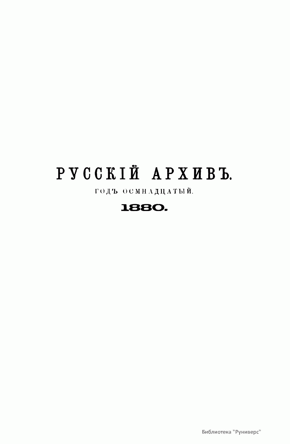 «Русский архив» — ежемесячный историко-литературный журнал, издававшийся в Москве с 1863 по 1917 год. Создателем и продолжительные годы редактором журнала был П. И. Бартенев – историк, археограф, библиограф. Этот журнал называли «живой картиной былого», поскольку он содержал преимущественно публикации неизданных мемуарных, эпистолярных, литературно-художественных и ведомственных документальных материалов, освещавших культурную и политическую историю России в XVIII и XIX вв. По числу опубликованных источников «Русский архив» стоит на первом месте среди русских исторических журналов.