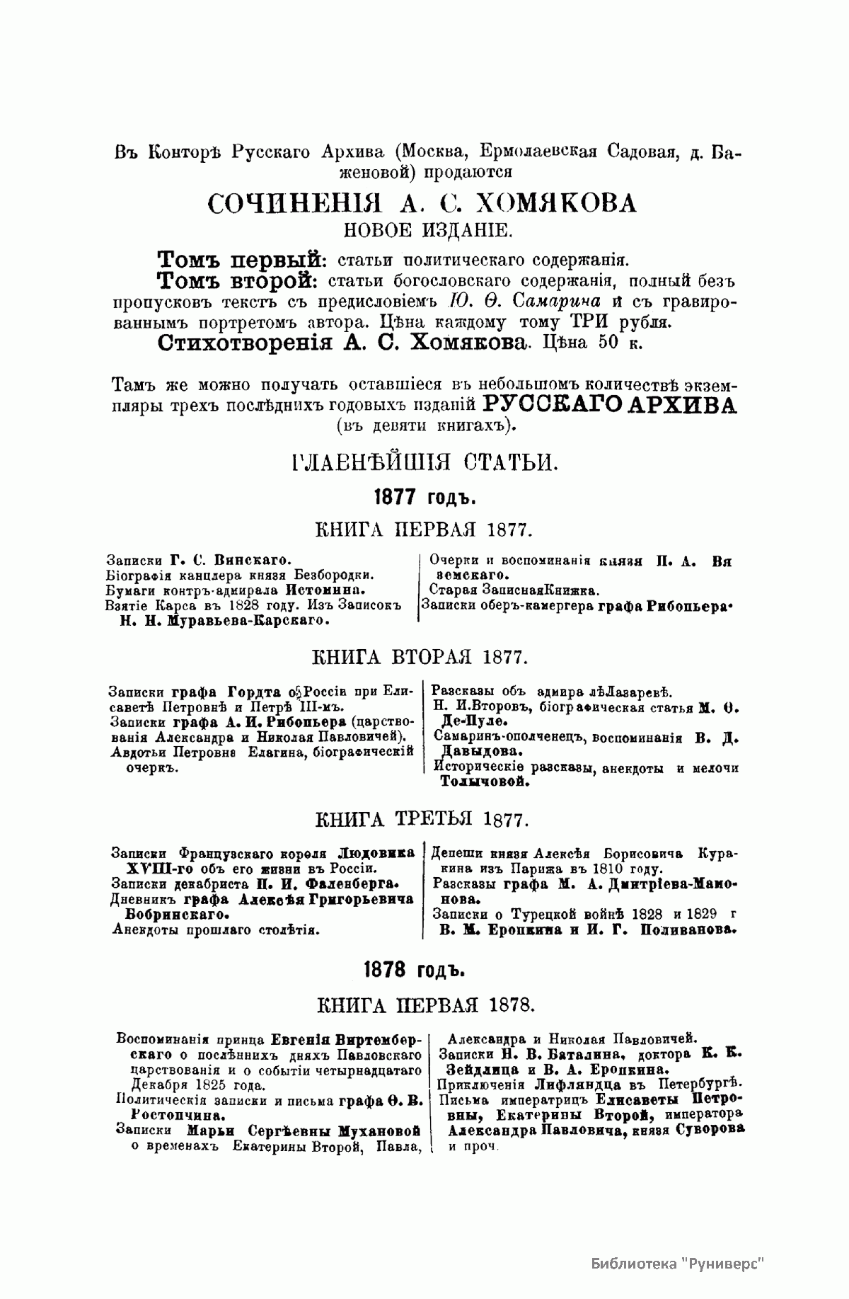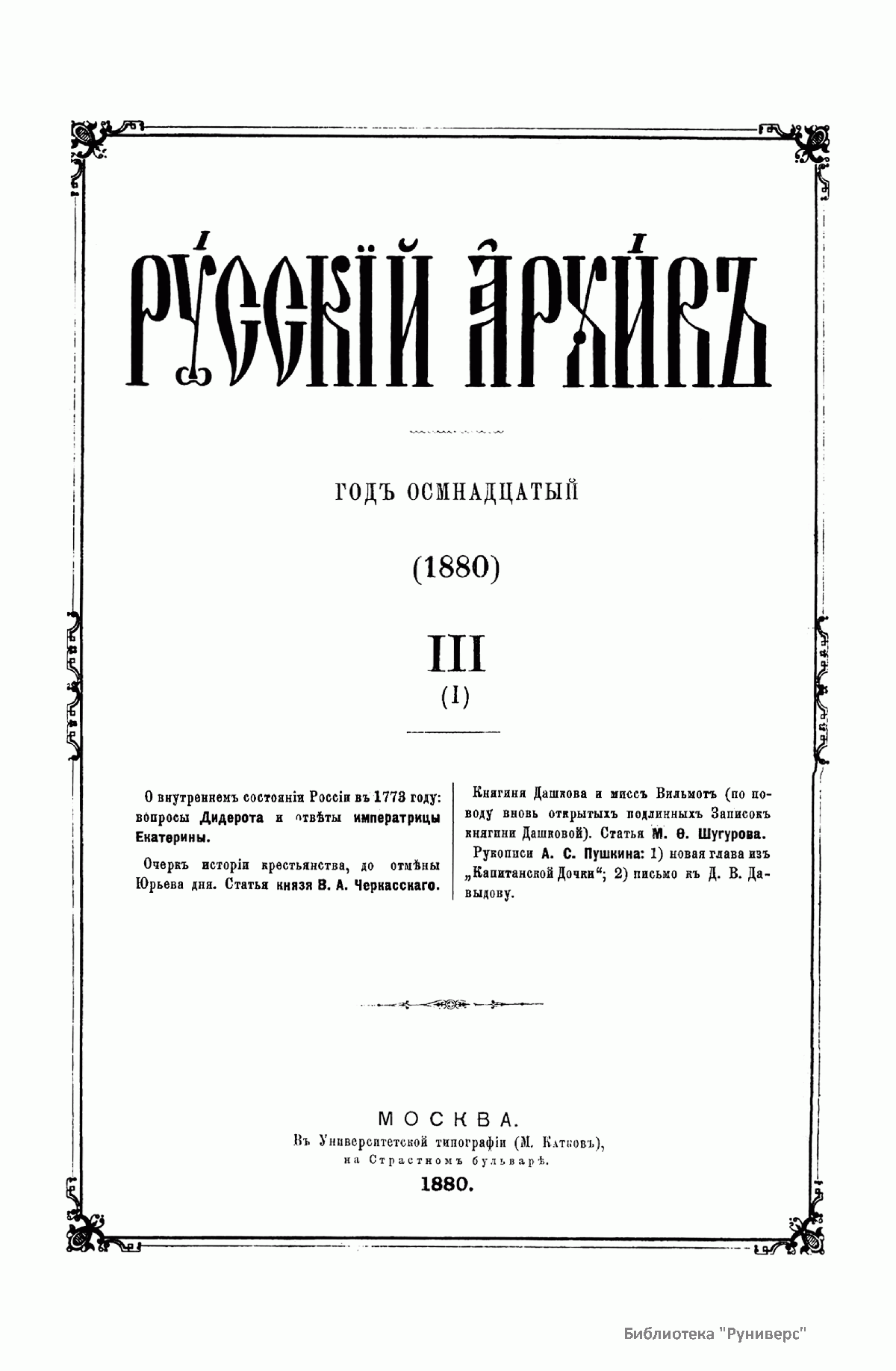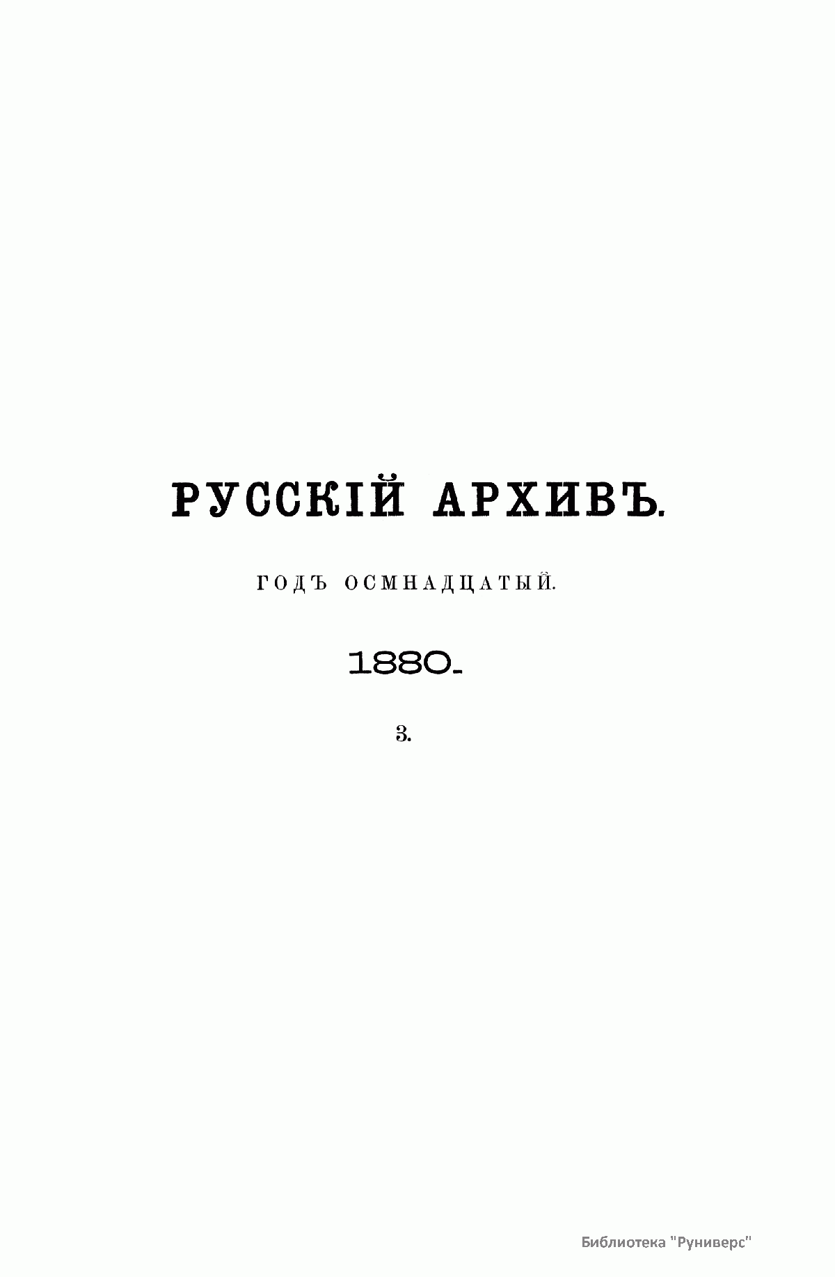 «Русский архив» — ежемесячный историко-литературный журнал, издававшийся в Москве с 1863 по 1917 год. Создателем и продолжительные годы редактором журнала был П. И. Бартенев – историк, археограф, библиограф. Этот журнал называли «живой картиной былого», поскольку он содержал преимущественно публикации неизданных мемуарных, эпистолярных, литературно-художественных и ведомственных документальных материалов, освещавших культурную и политическую историю России в XVIII и XIX вв. По числу опубликованных источников «Русский архив» стоит на первом месте среди русских исторических журналов.