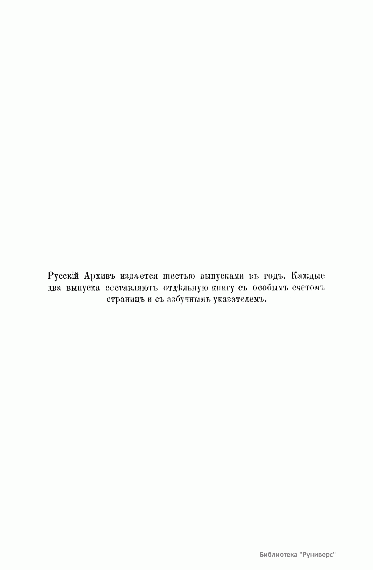 «Русский архив» — ежемесячный историко-литературный журнал, издававшийся в Москве с 1863 по 1917 год. Создателем и продолжительные годы редактором журнала был П. И. Бартенев – историк, археограф, библиограф. Этот журнал называли «живой картиной былого», поскольку он содержал преимущественно публикации неизданных мемуарных, эпистолярных, литературно-художественных и ведомственных документальных материалов, освещавших культурную и политическую историю России в XVIII и XIX вв. По числу опубликованных источников «Русский архив» стоит на первом месте среди русских исторических журналов.