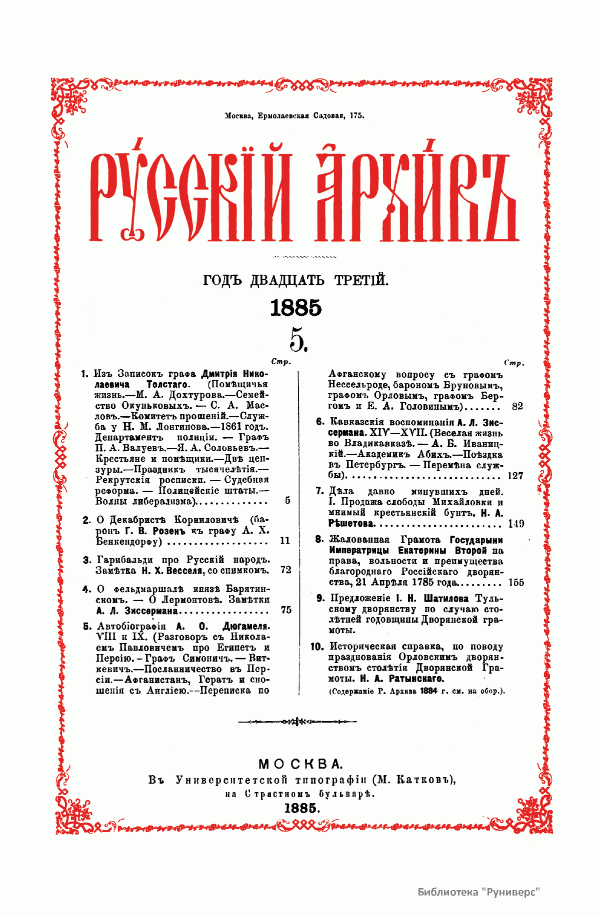 Русскiй архивъ. Историко-литературный сборникъ. 1885. Выпуски 5-8